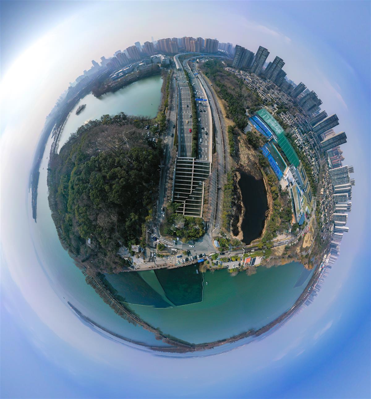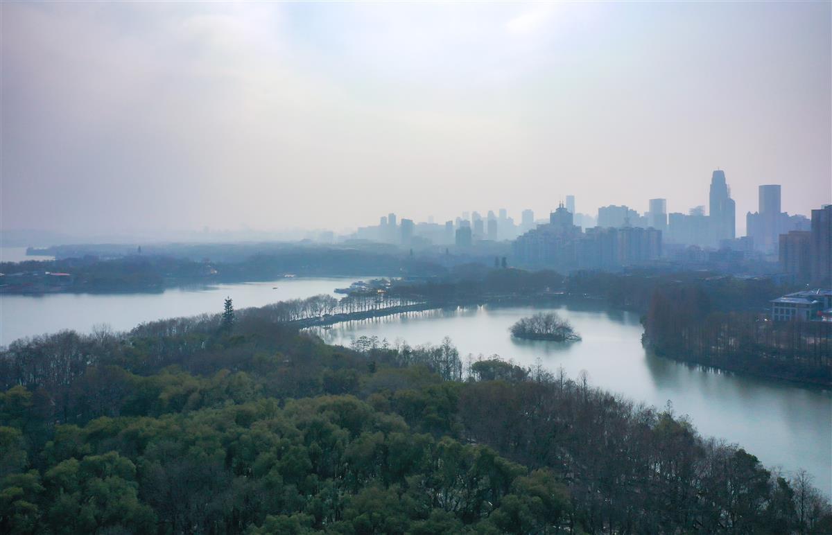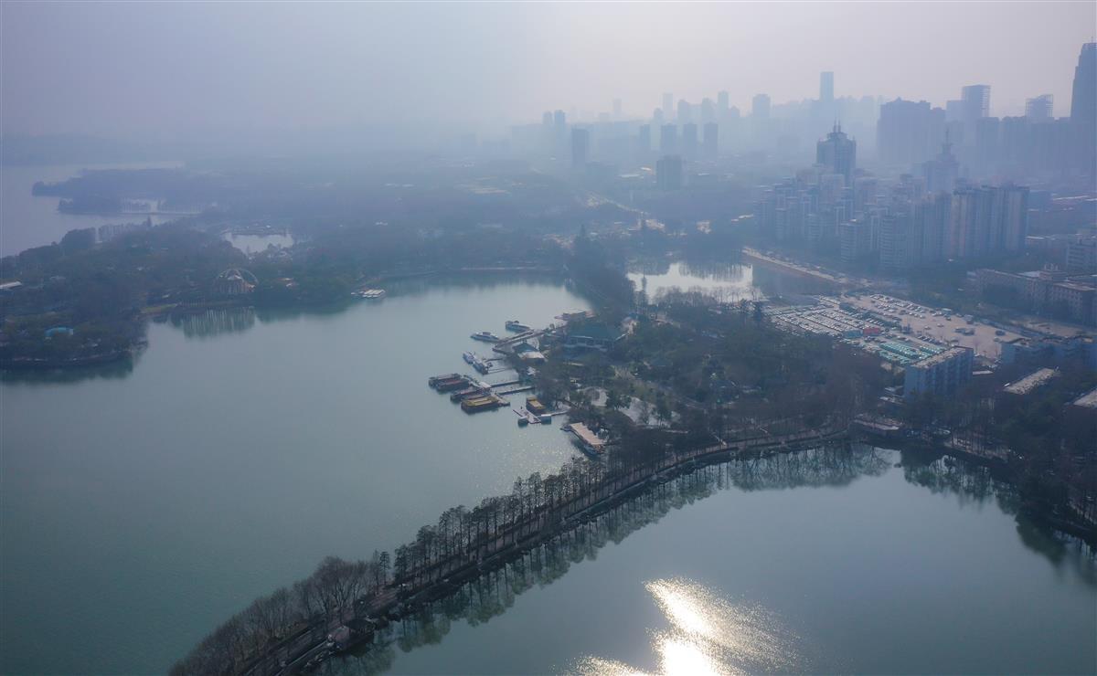 上午阳光透过云层洒向大地,整个城市仿佛被金色的光芒笼罩。高楼大厦间,白色的雾气升腾,仿佛一幅水墨画。东湖公园内,湖面上残留的冰雪在阳光下闪闪发光,与周围的亭台楼阁、小桥流水交相辉映,构成了一幅美丽的画卷。