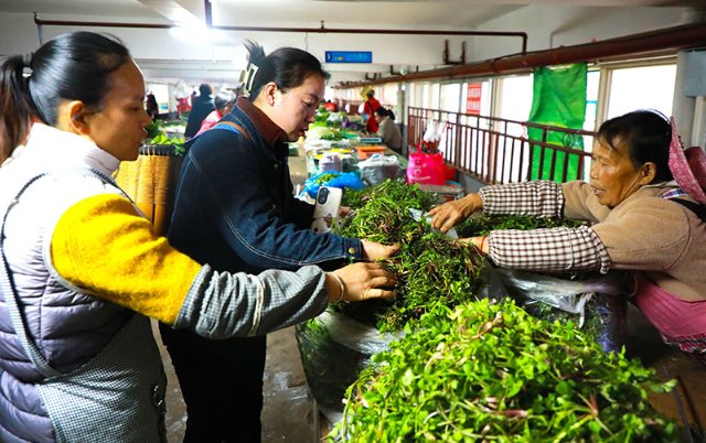 日前,春城晚报-开屏新闻记者在曲靖市富源县金城农贸市场看到,干净新鲜的春菜被分门别类摆放在摊位上,椿芽、棠梨花等时令春菜十分诱人,吸引不少市民驻足购买。听说春菜上市,市民姚蕊特意赶早到农贸市场购买,她在春菜中再三挑选,最终选择买下棠梨花和蚕豆。