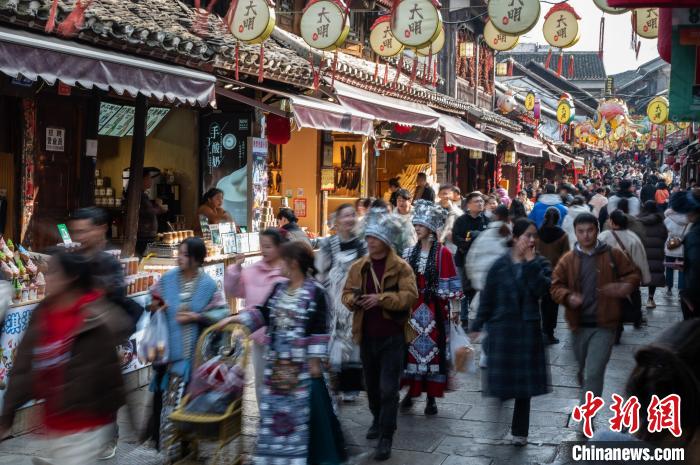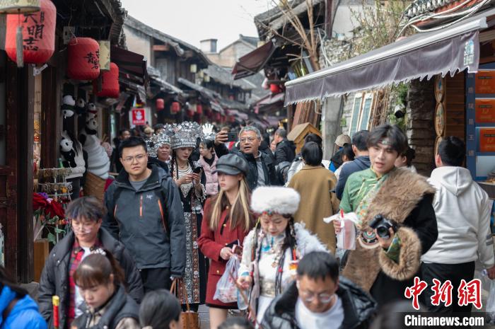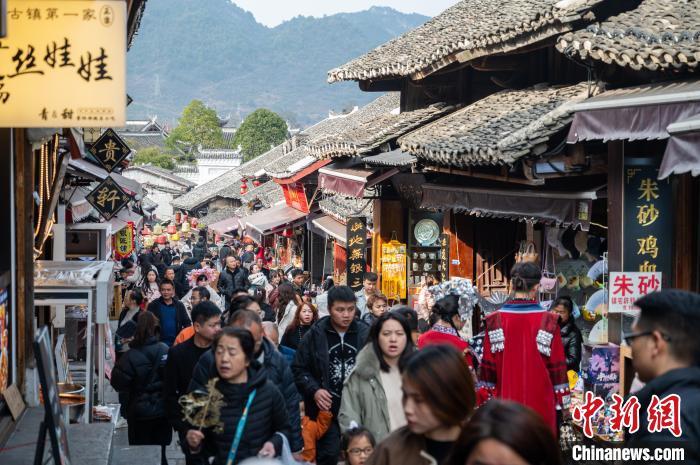 3月2日,贵州省贵阳市青岩古镇景区吸引众多民众前来游玩拍照,乐享周末时光。青岩古镇是贵州四大古镇之一,为明清两代军事重镇,古镇内明清古建筑交错密布,2017年2月古镇被评为中国国家5A级旅游景区。2023年12月,青岩古镇南北明清街旅游休闲街区入选第三批国家级旅游休闲街区。
