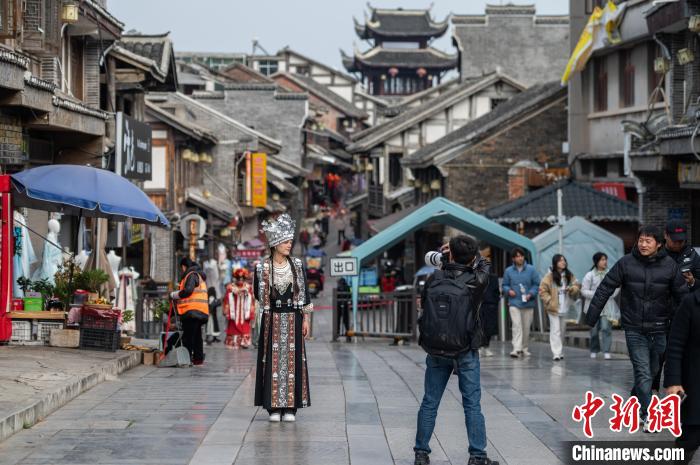 3月2日,游客在贵阳青岩古镇游玩拍照。唐哲摄
