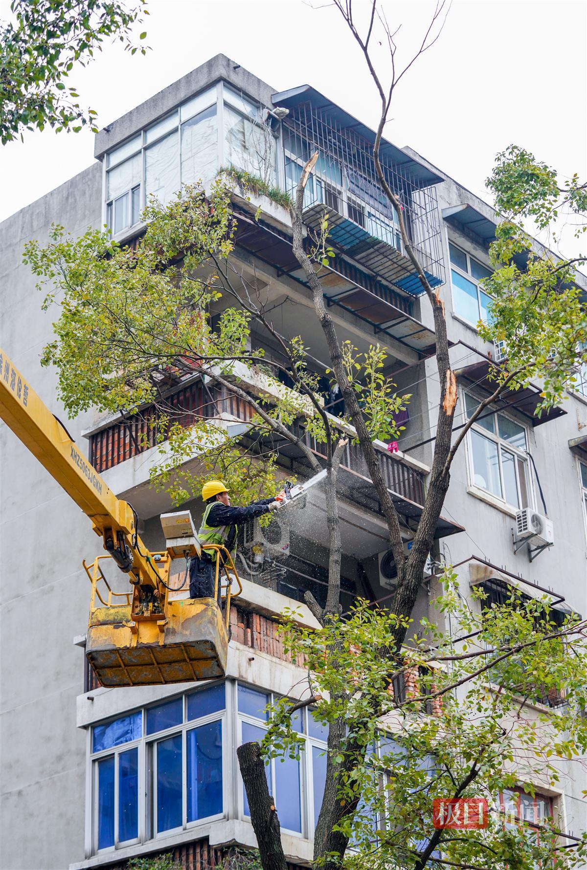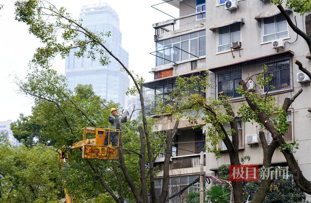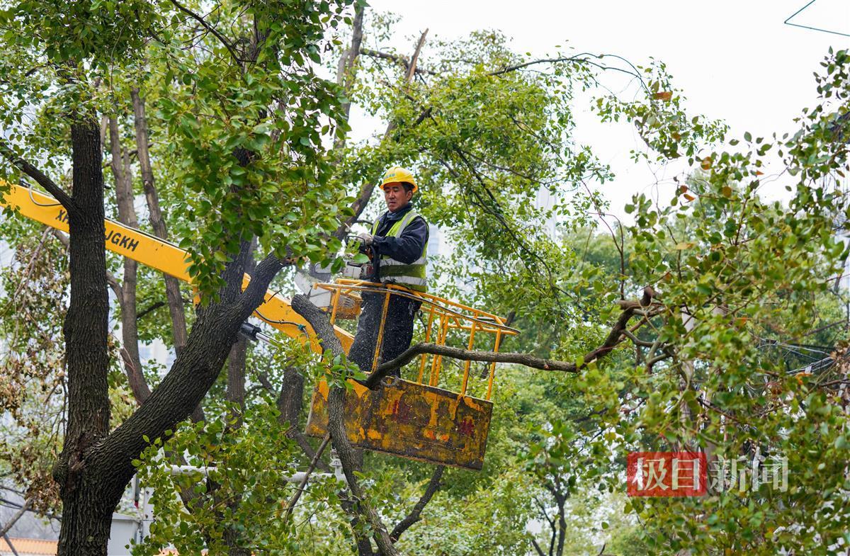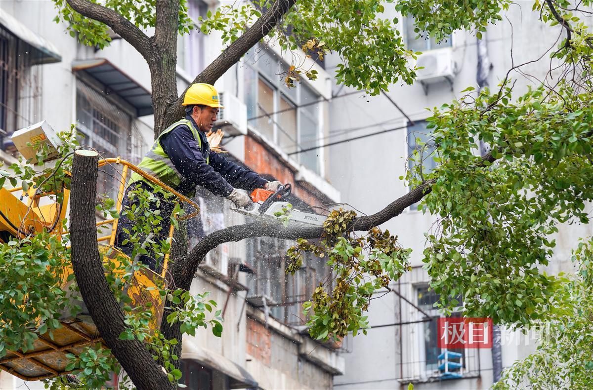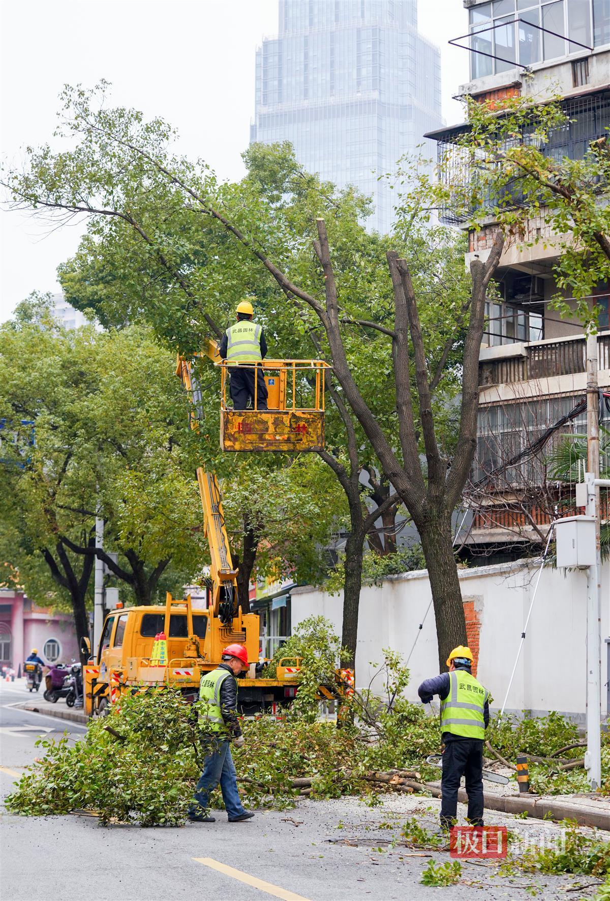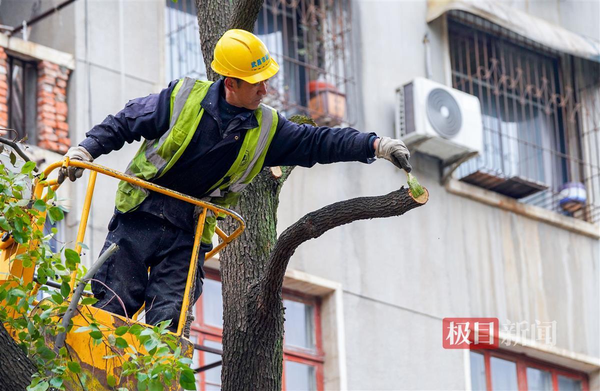 3月6日,极目新闻记者在武汉市武昌东亭路、翠柳街等路段看到,园林职工正借助云梯车、电锯等机械设备,对路边受损的樟树进行截枝和修剪,并在截枝的截面上涂抹既可防虫又可保湿的树漆。
