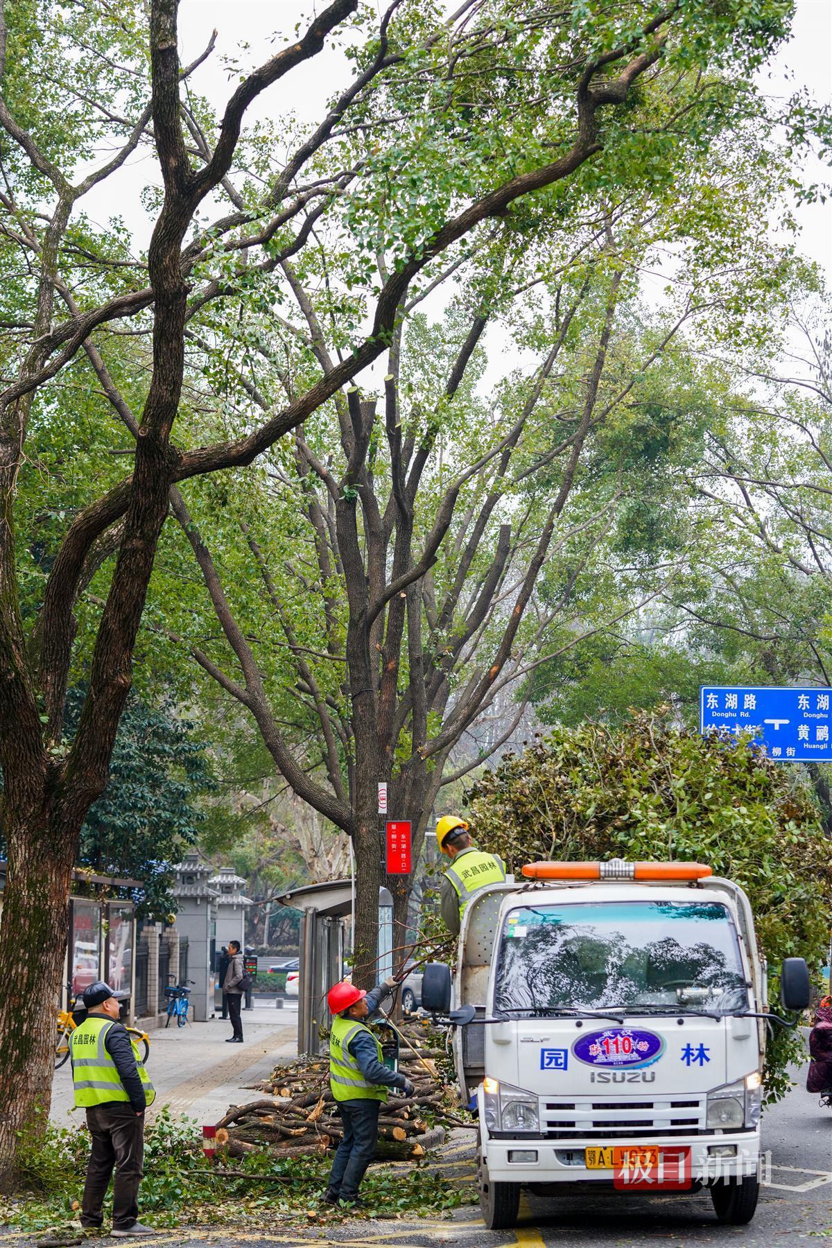 据悉,春节前低温冻雨天气导致武汉市许多樟树等行道树折断,前期园林等部门已将大量的断枝清理完毕,近期园林部门又对这些受损的行道树进行集中截枝和“理发”。