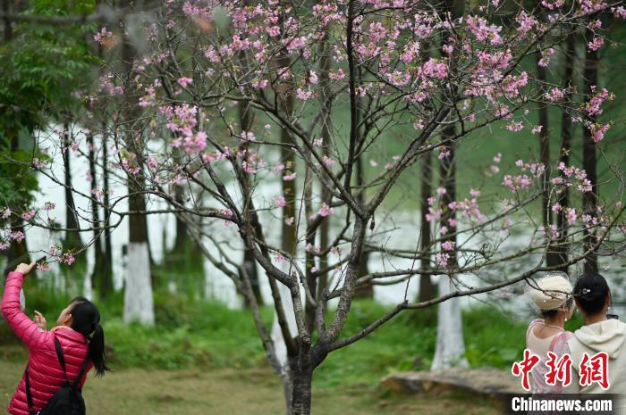3月7日,广州市黄埔区创业公园的樱花绽放,吸引游客赏花拍照。陈楚红摄