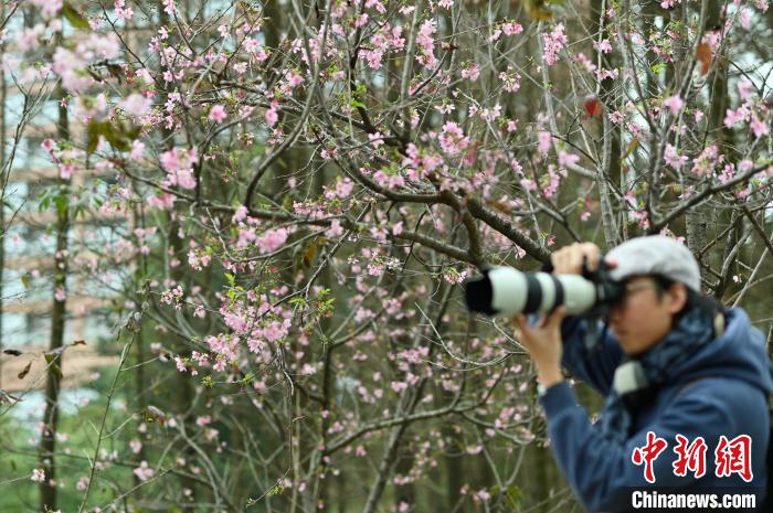 3月7日,广州市黄埔区创业公园樱花绽放,吸引游客前来观赏拍照。