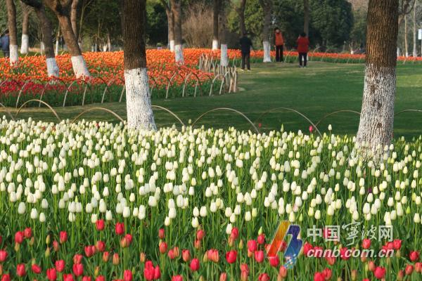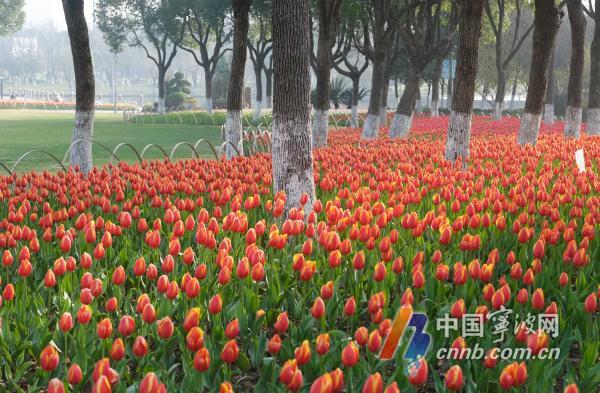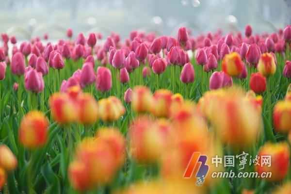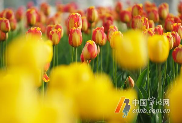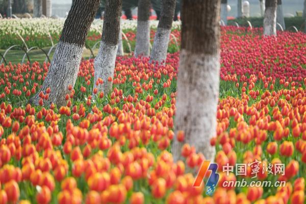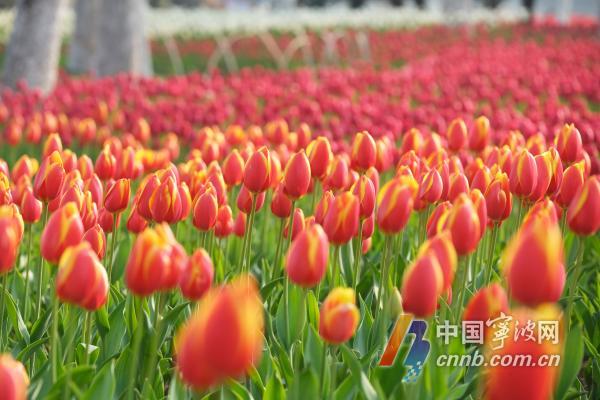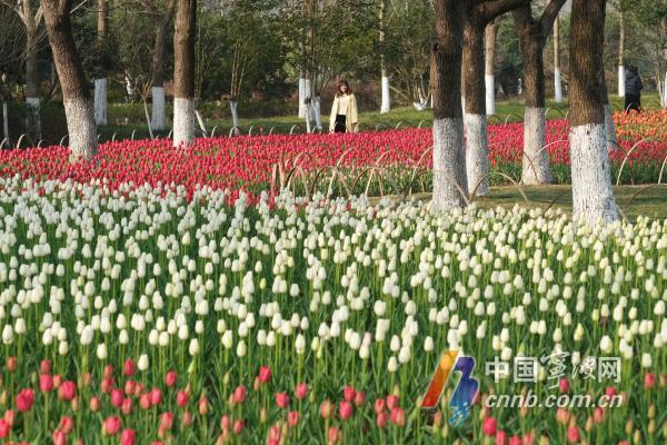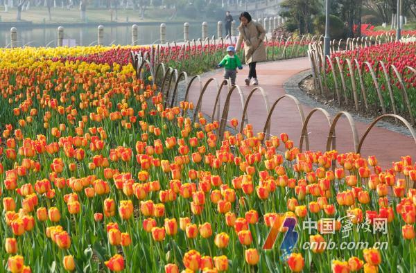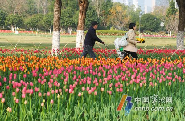 3月8日早上,春和日丽,鄞州院士公园里种植的19万株郁金香竞相开放。