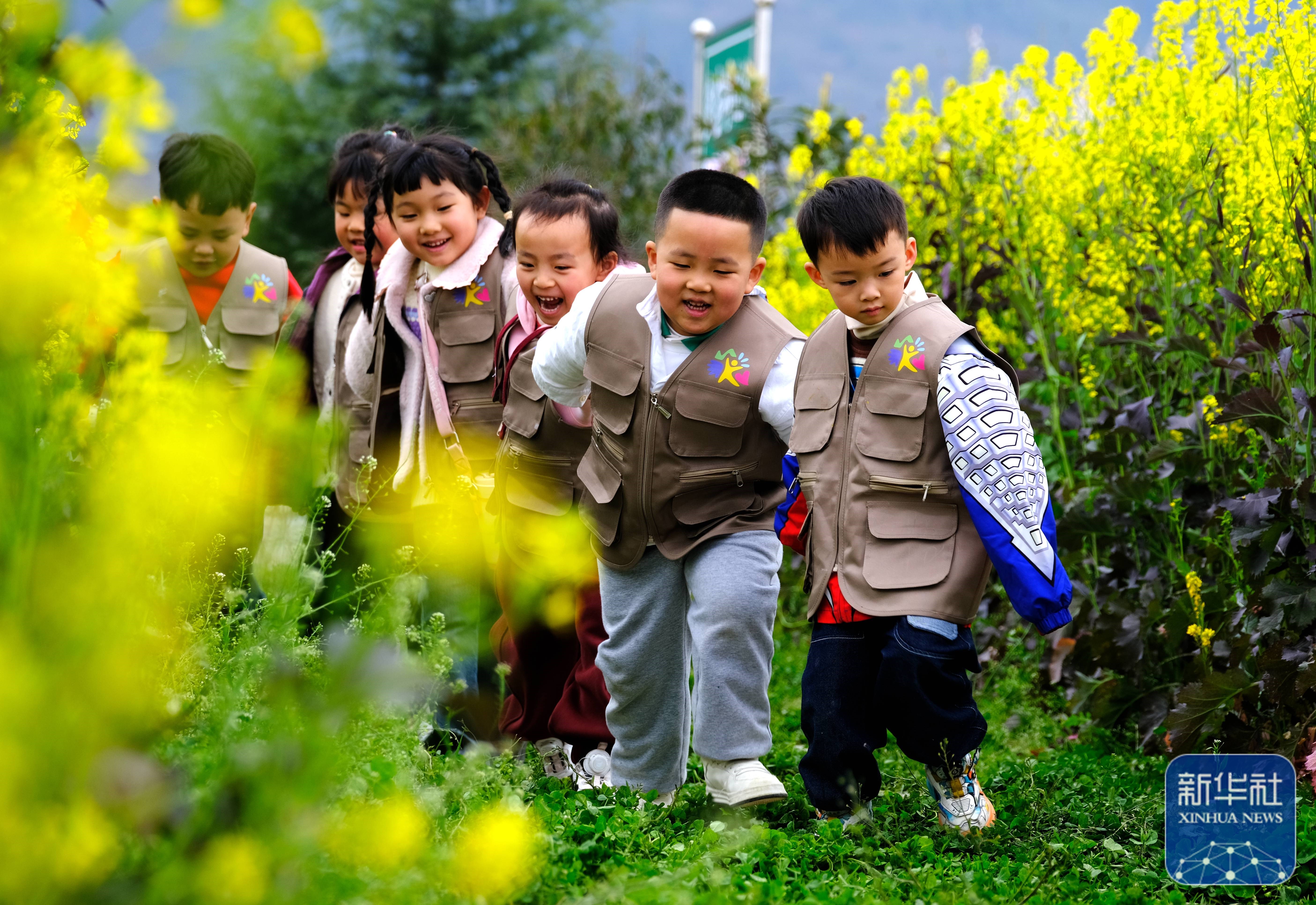 ↑3月12日,小朋友在贵州省遵义市绥阳县风华镇的一家农场内赏花游玩。新华社发(李珊珊摄)