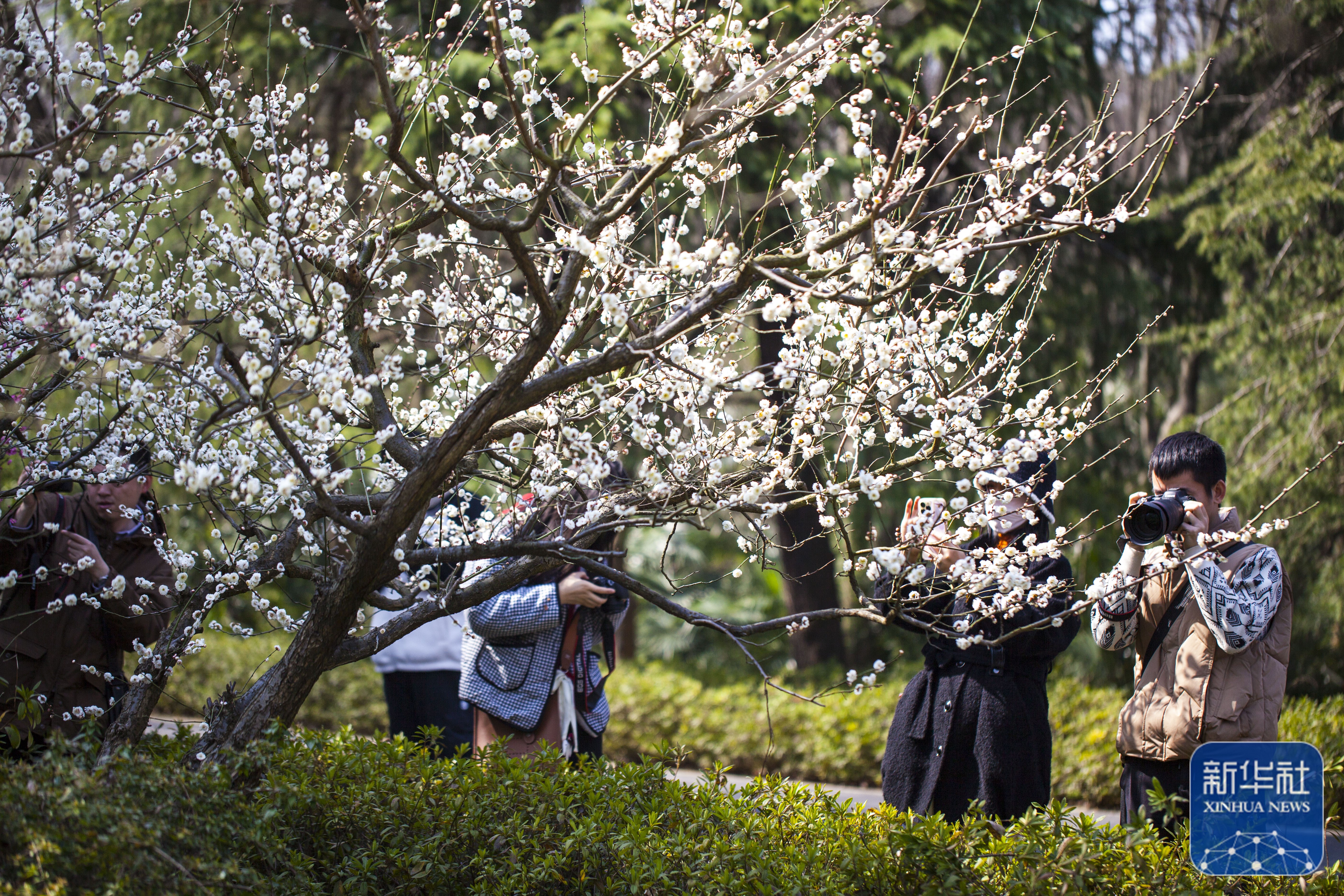 ↑3月13日,游人在南京雨花台风景区拍摄梅花。新华社发(孙忠南摄)