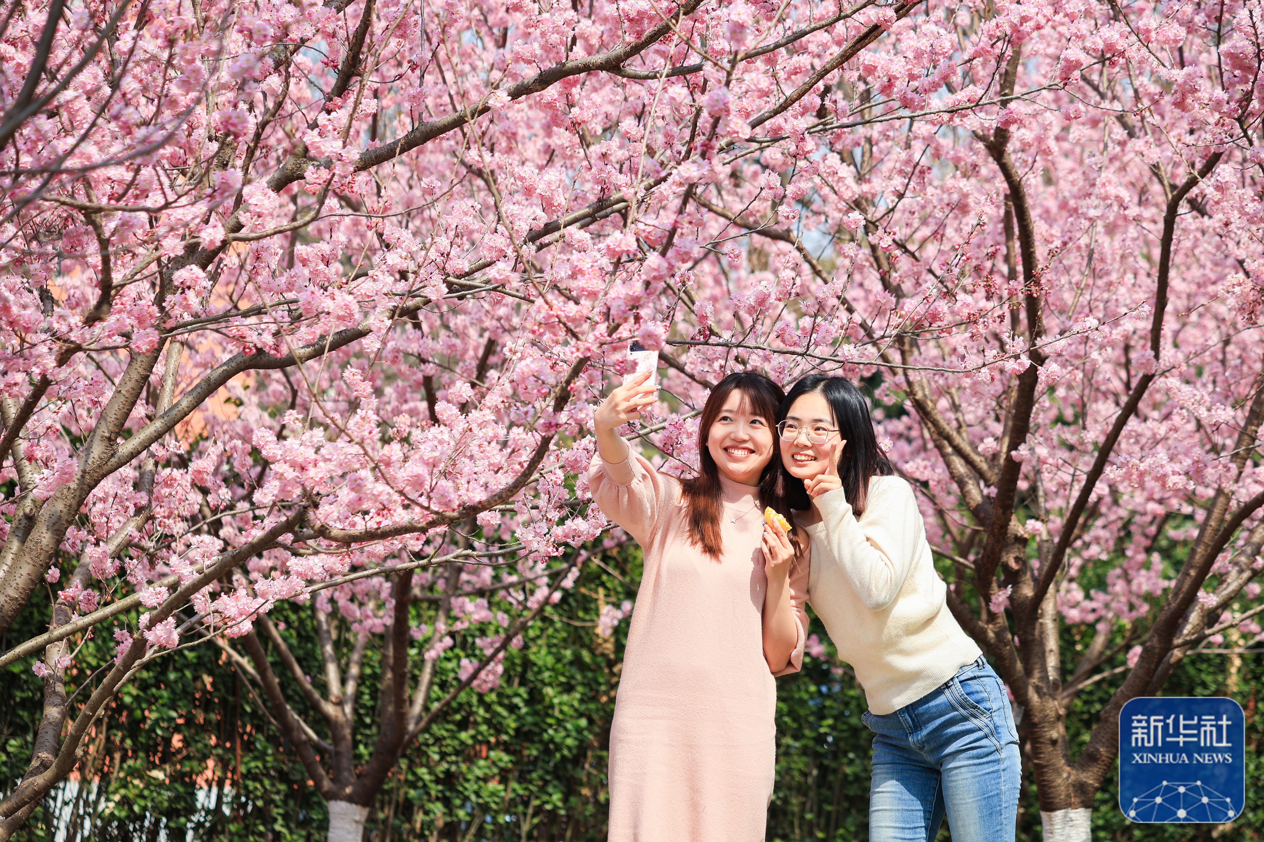 ↑3月13日,市民在河北省石家庄市桥西区平安公园赏花。新华社发(陈其保摄)