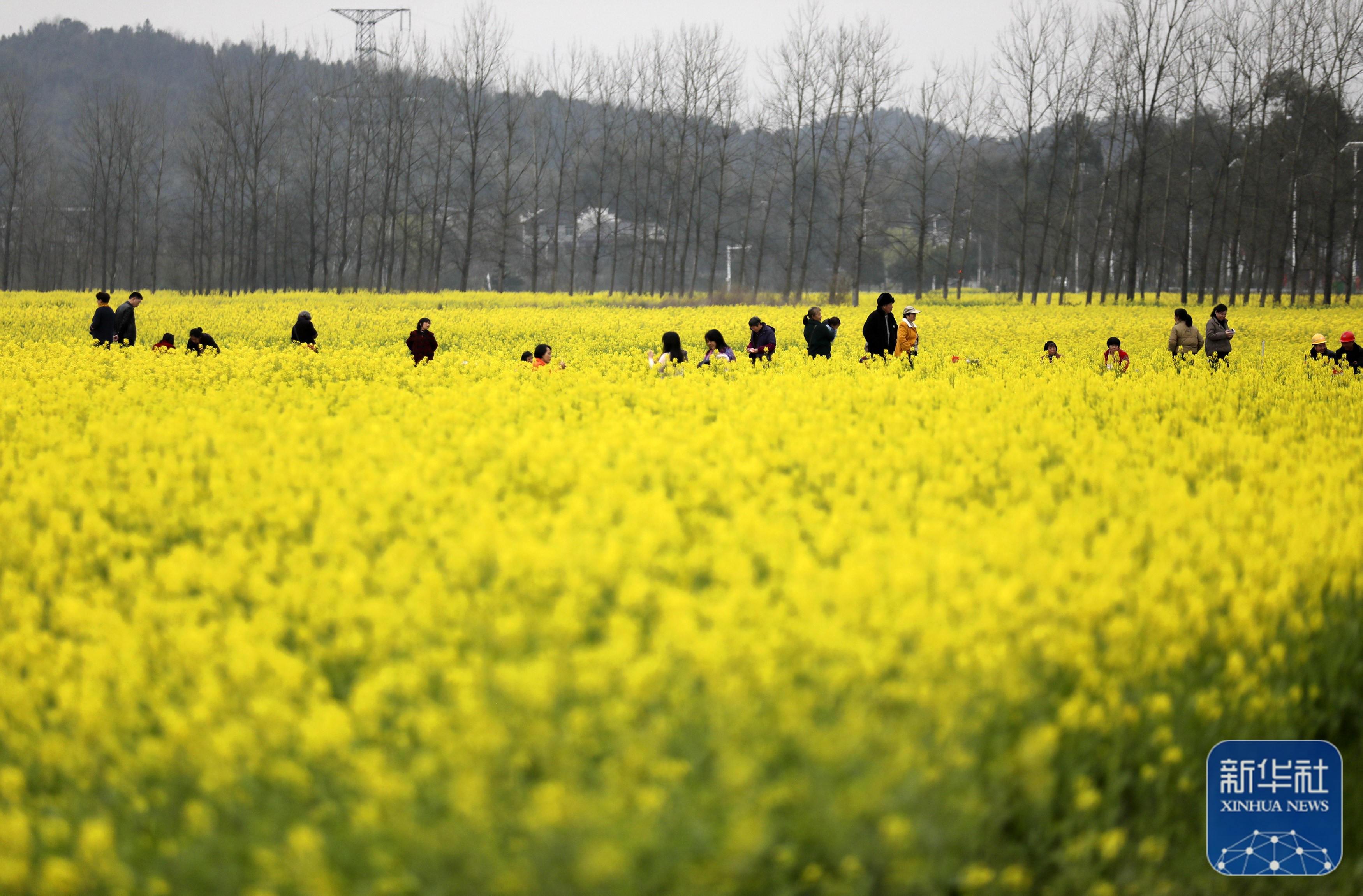 ↑3月13日,游客在湖南省资兴市蓼江镇油菜花海赏景游玩。新华社发(李科摄)