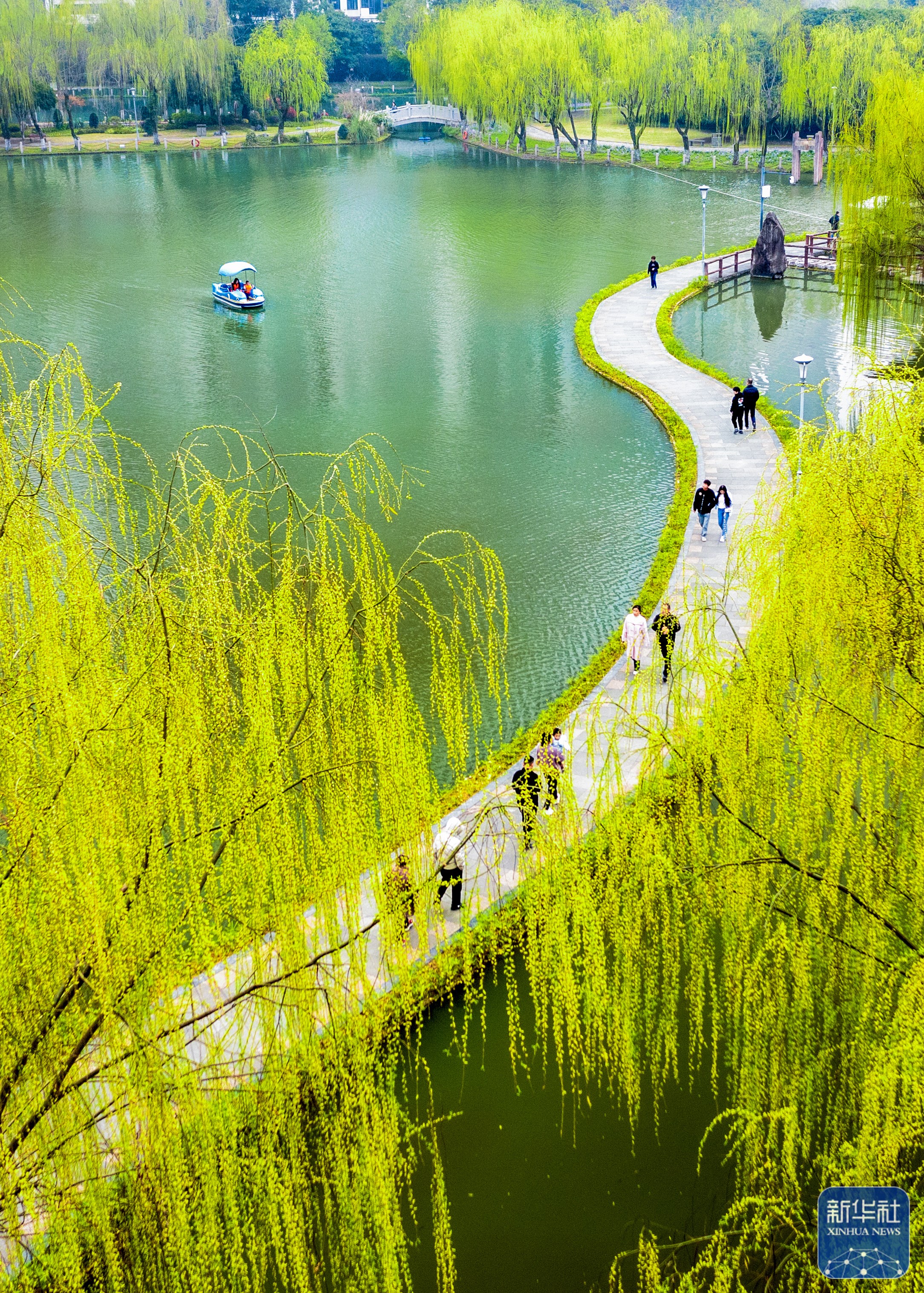 ↑3月13日,市民在浙江省温州市马鞍池公园踏青(无人机照片)。新华社发(刘吉利摄)