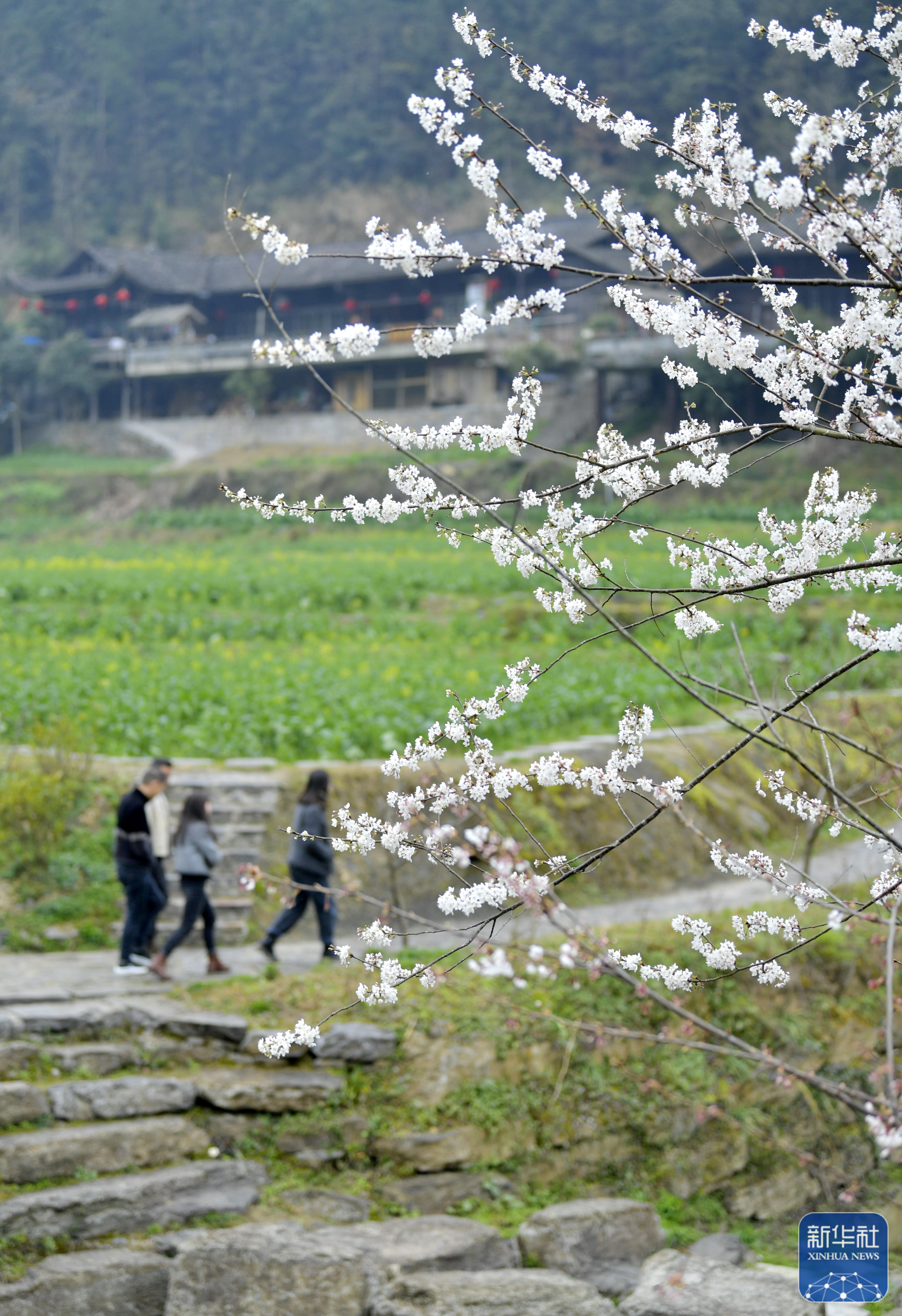 ↑3月13日,游客伴着花香游览湖北省恩施土家族苗族自治州宣恩县彭家寨古吊脚楼。新华社发(宋文摄)