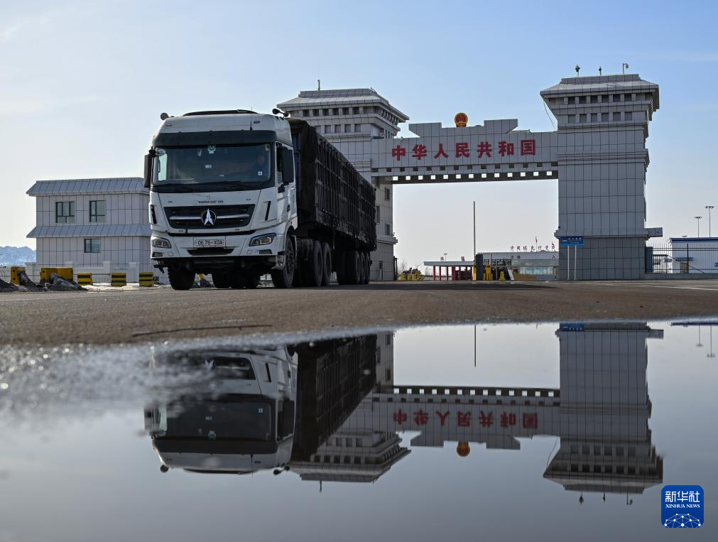 3月13日,在新疆塔克什肯口岸,运输车辆通过国门。