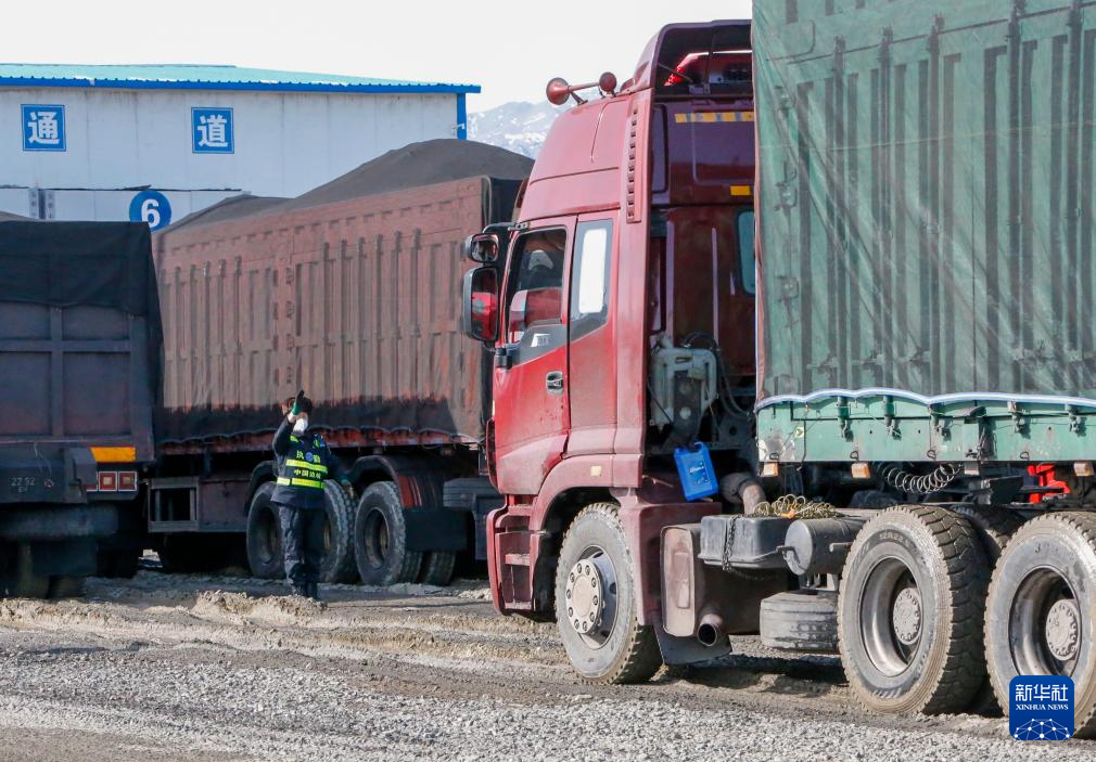 3月13日,在新疆塔克什肯口岸,工作人员引导入境焦煤运输车辆过检。