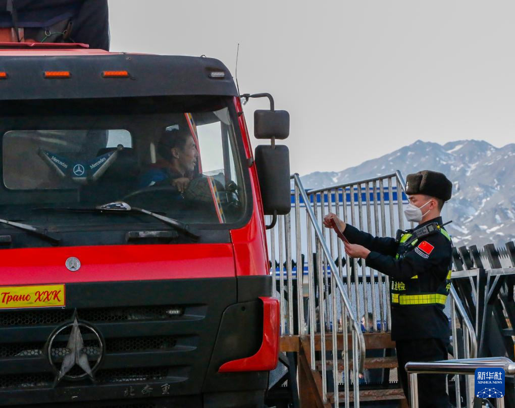 3月13日,在新疆塔克什肯口岸,民警核验司机证件。
