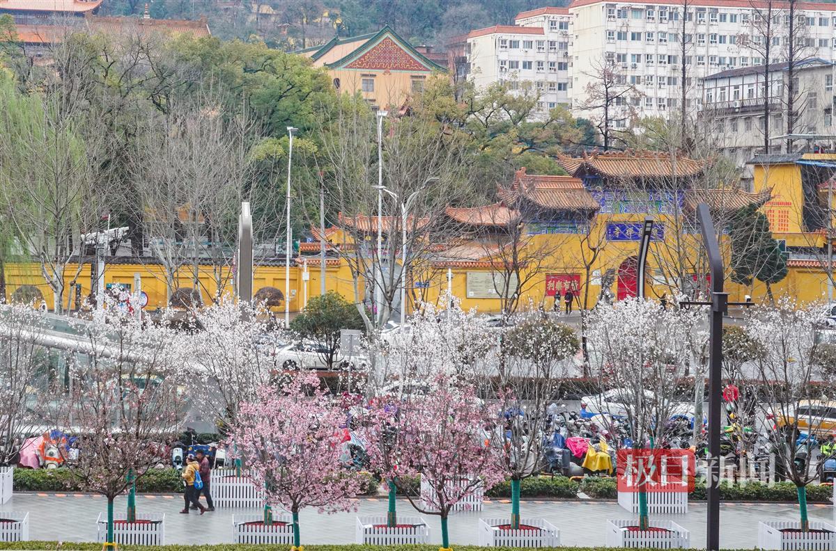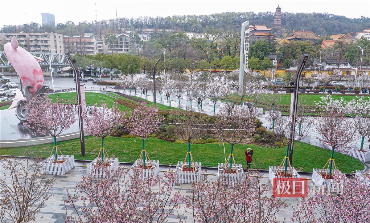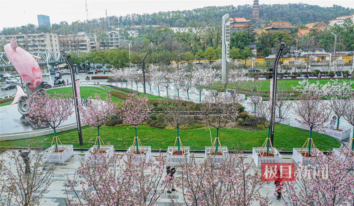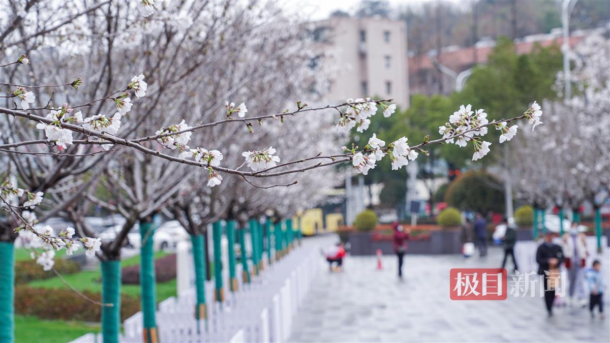 红如云霞的早樱、粉白如雪的中樱同框绽放在枝头,满树花蕾和花瓣在春雨的沐浴下显得饱满剔透。樱花树旁“佩戴”着樱花的江豚雕塑,更是充满着艺术气息,粉色、白色的花海掩映着赏花小径,驻足观赏的市民络绎不绝,人在花中,仿佛置身童话世界。缤纷盛开的樱花如云霞,撩拨着满城春色四溢。