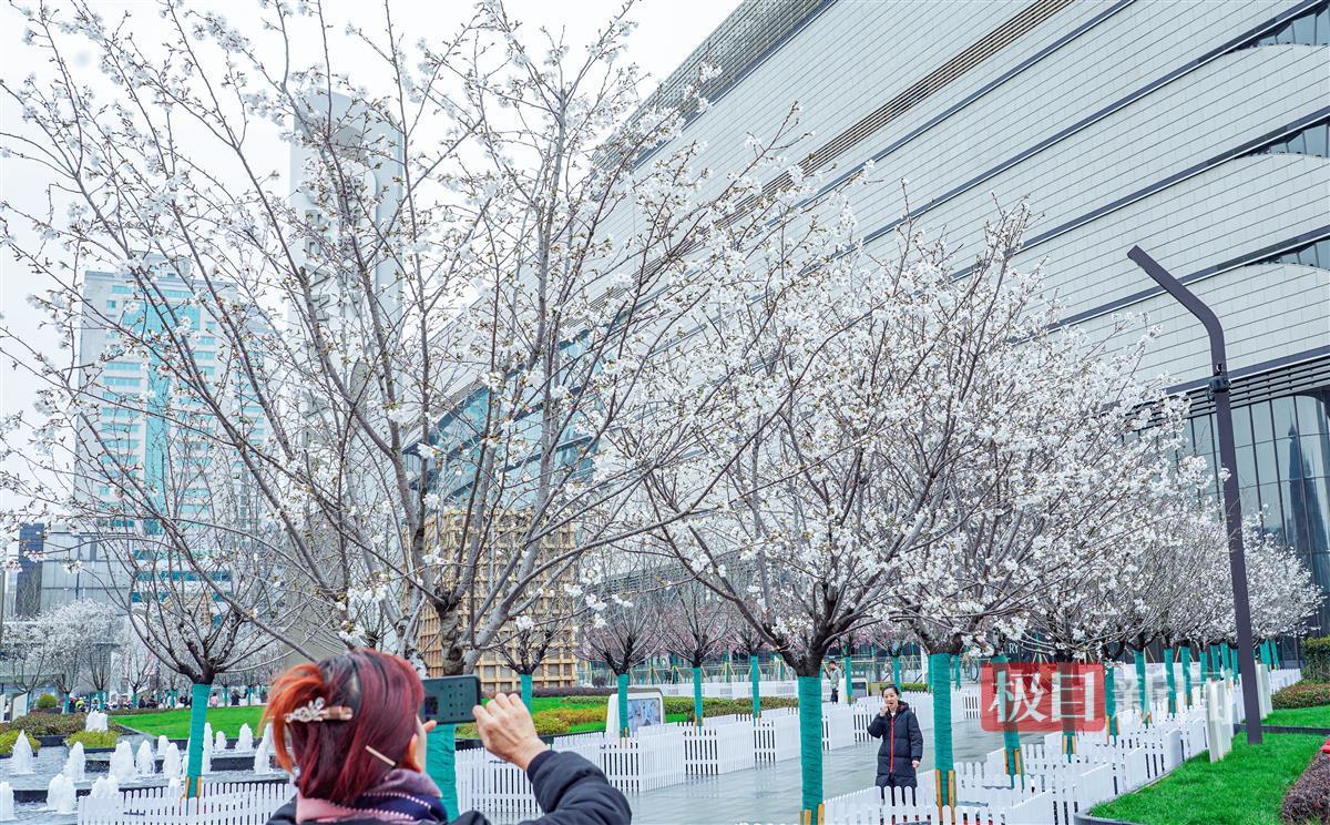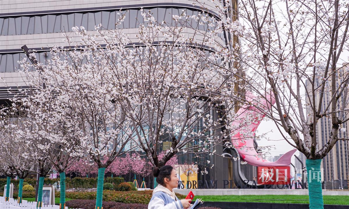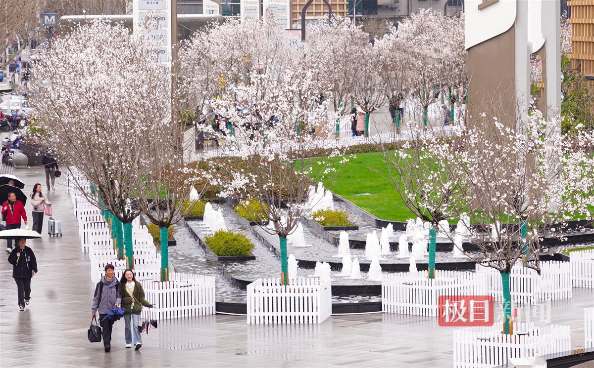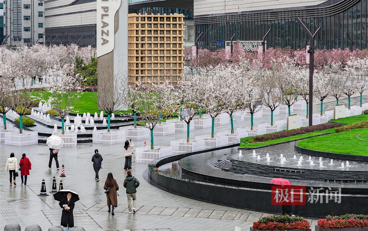 3月18日,在春雨的撩拨下,武汉武昌武珞路梦时代广场上的樱花正在次第绽放。