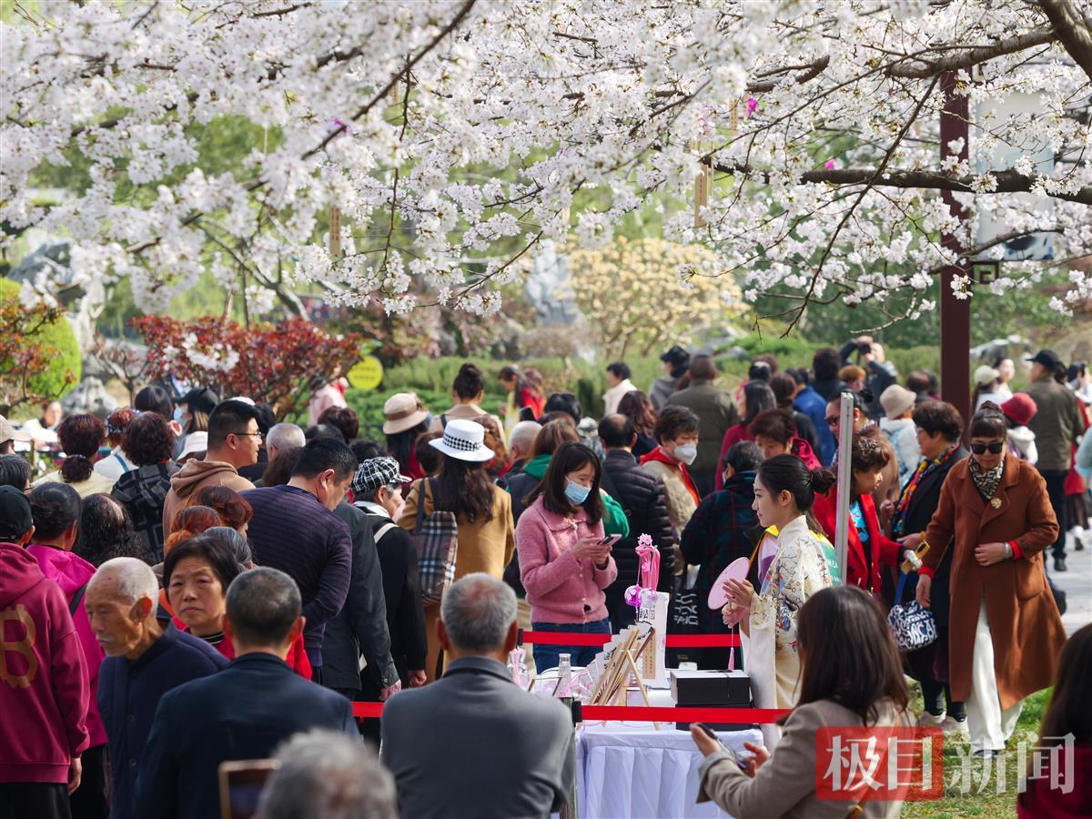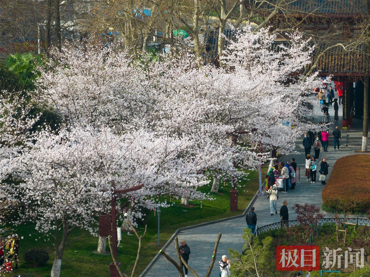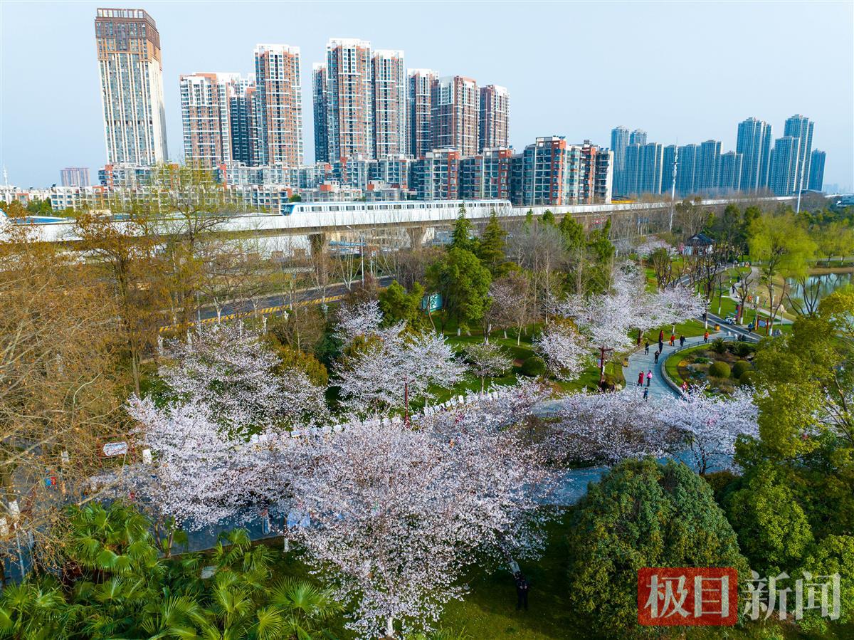 3月19日,武汉市堤角公园樱花绽放,独有的“樱花轻轨”景观惊艳亮相。上午8时许,大量市民游客入园,在樱花树下打卡留影。