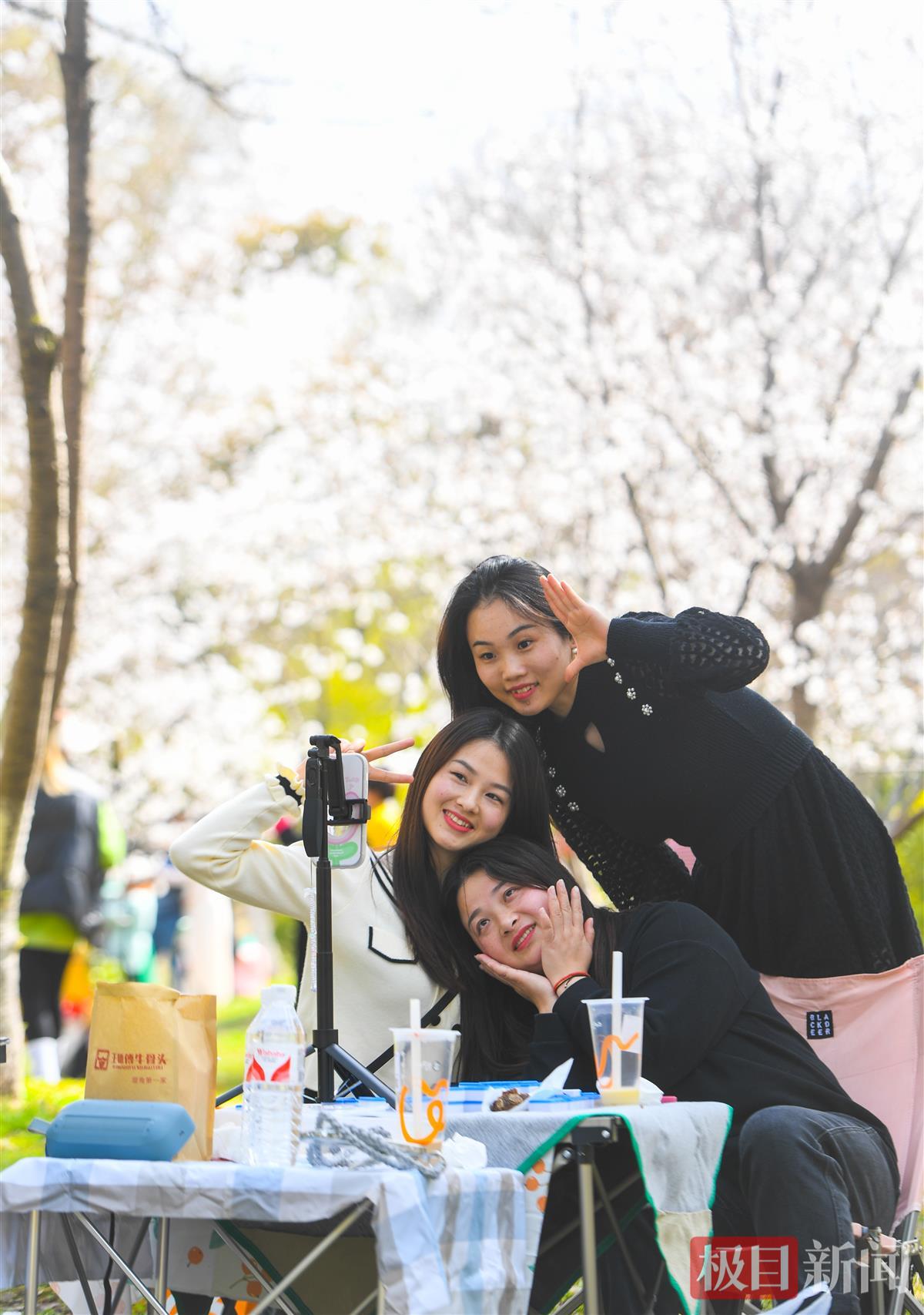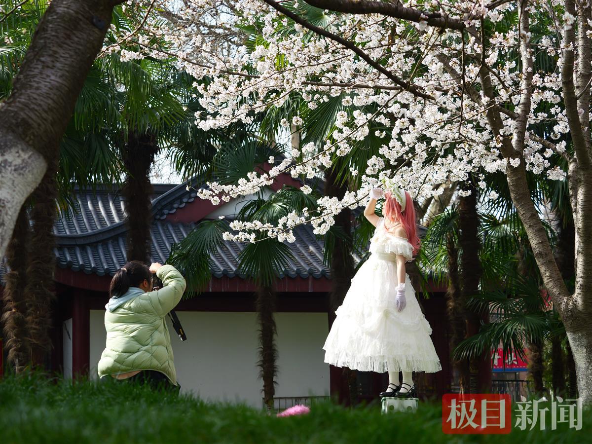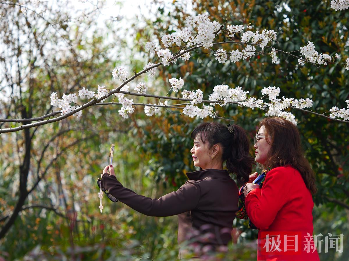 3月19日,武汉市堤角公园樱花绽放,独有的“樱花轻轨”景观惊艳亮相。上午8时许,大量市民游客入园,在樱花树下打卡留影。