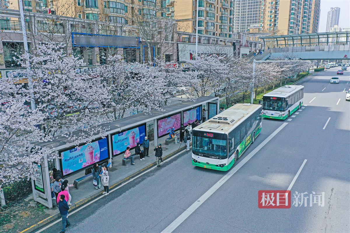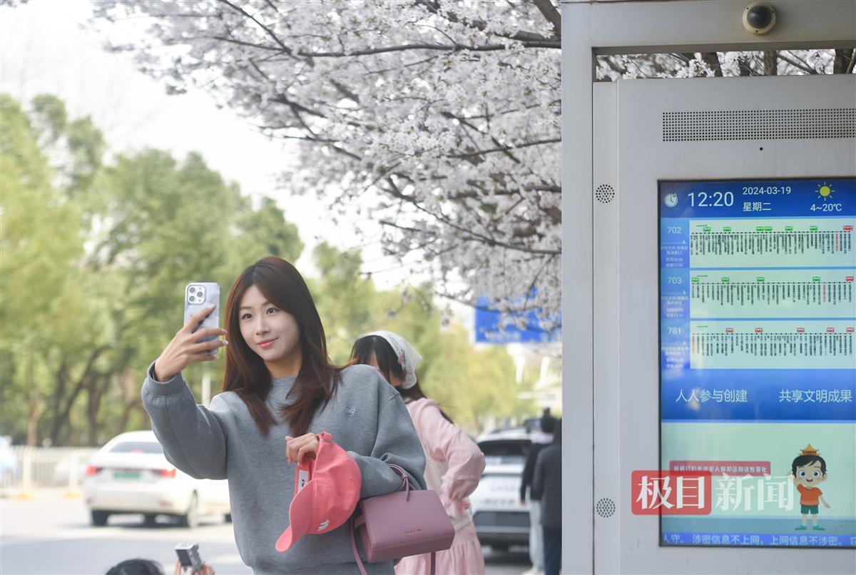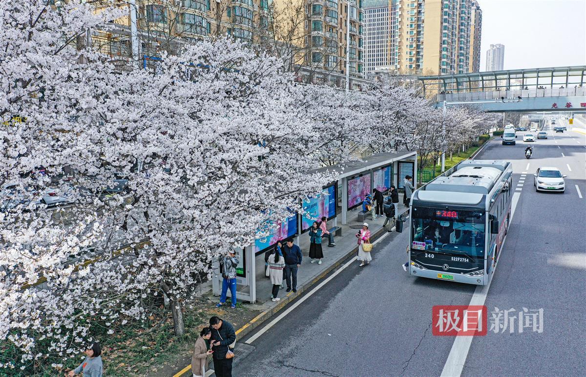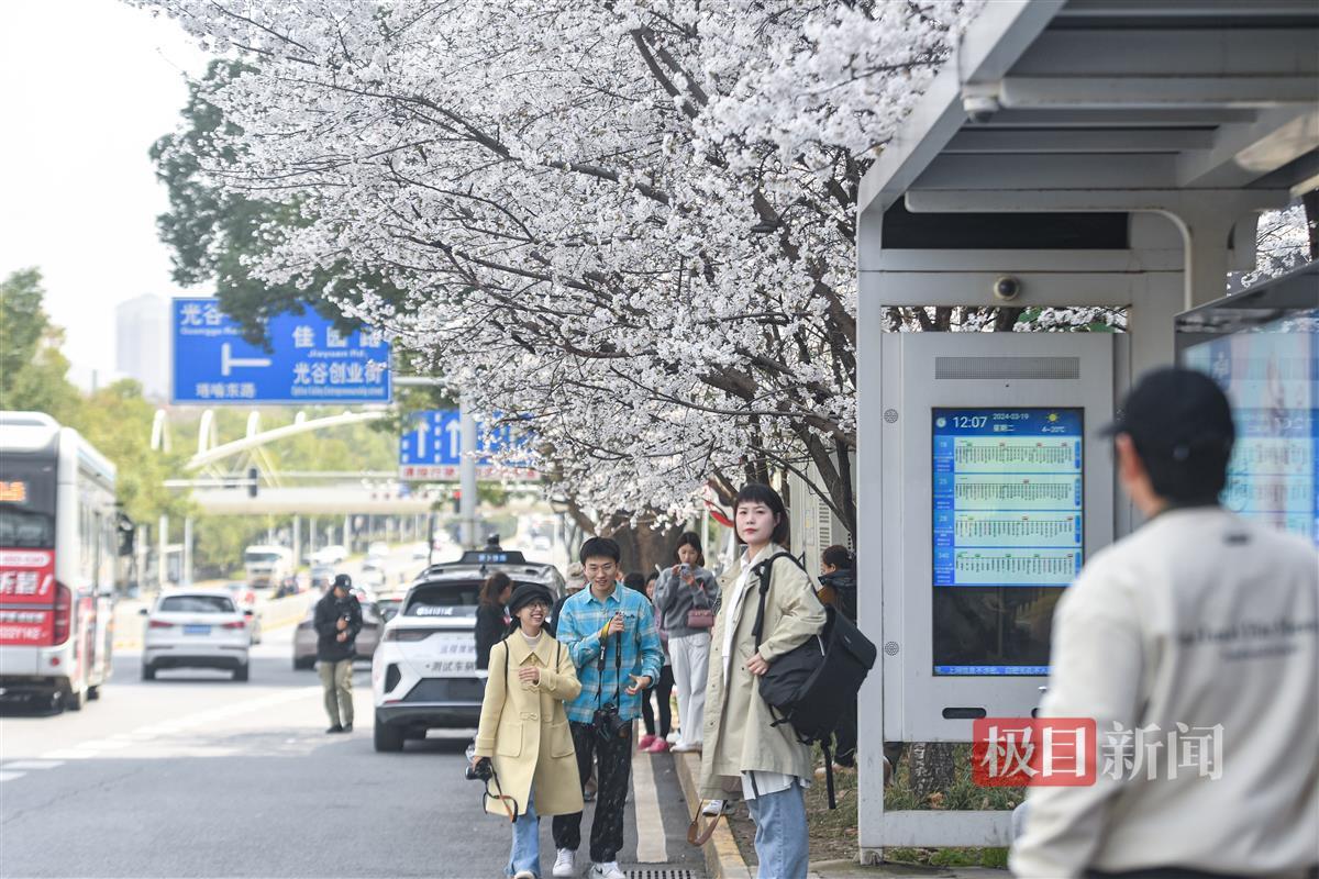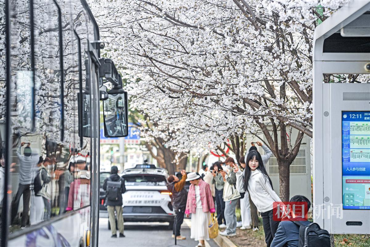 3月19日,武汉光谷珞喻东路大黄村公交站,环绕站台的11棵樱花树繁花朵朵。公交站内外,慕名而来的赏花人正忙着拍照打卡。