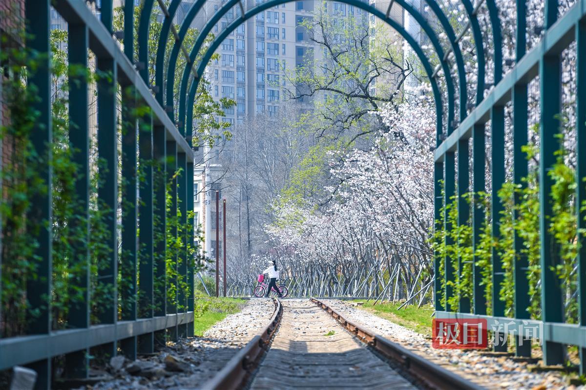3月21日,武昌生态文化长廊横穿和平公园路段,铁轨旁边有两段共几十米长的拱形围栏,仿佛一条“时光隧道”,走出隧道,樱花扑面而来,景观独特,引人入胜。