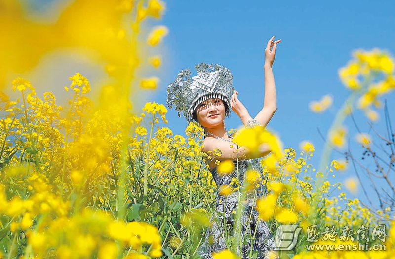 游客在建始县高坪镇石门村油菜花丛中留影。