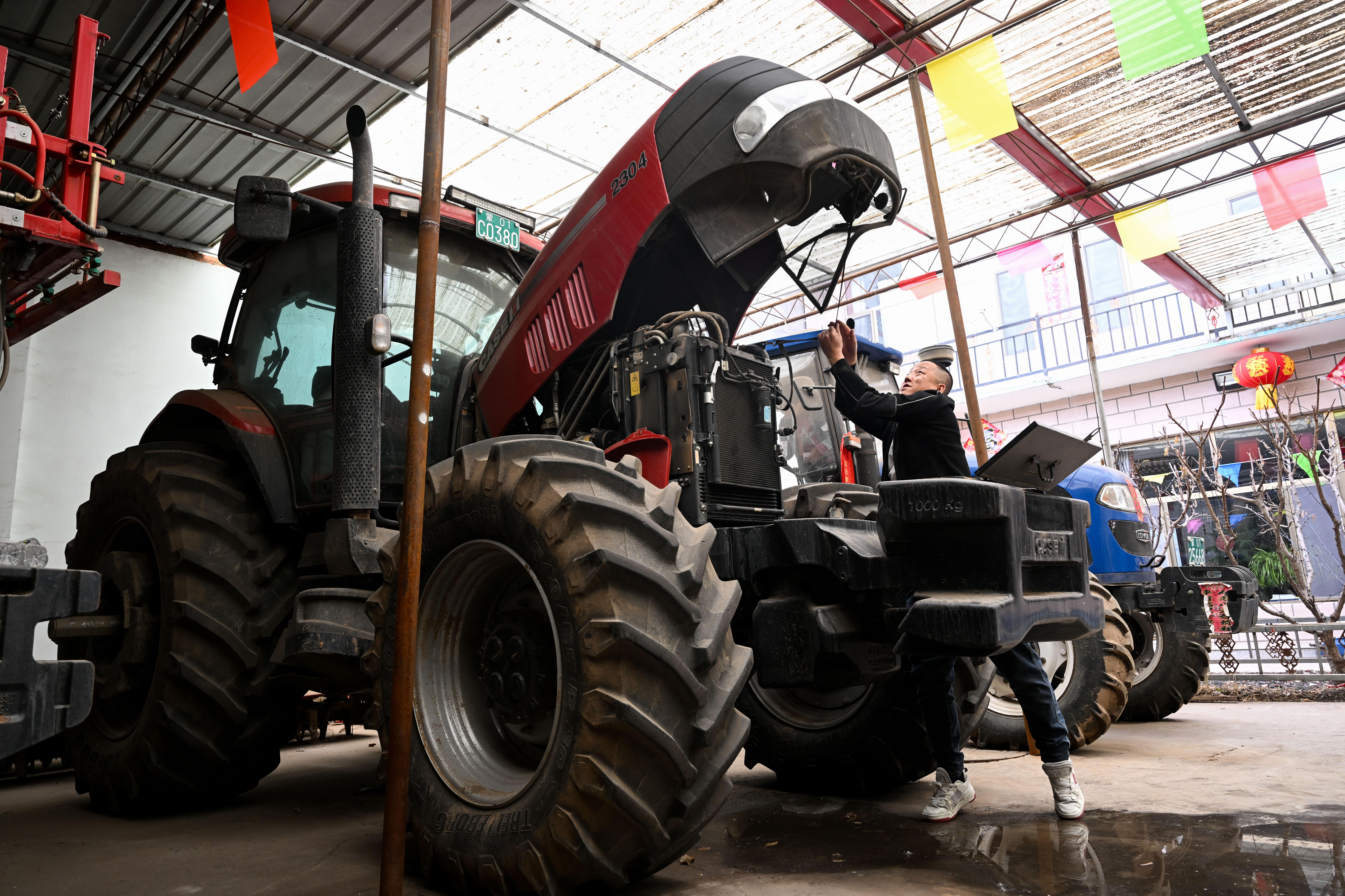 3月27日,合作社社员在内蒙古呼和浩特市赛罕区巴彦镇五路村万林专业农机合作社检修农机。 新华社记者 贝赫 摄