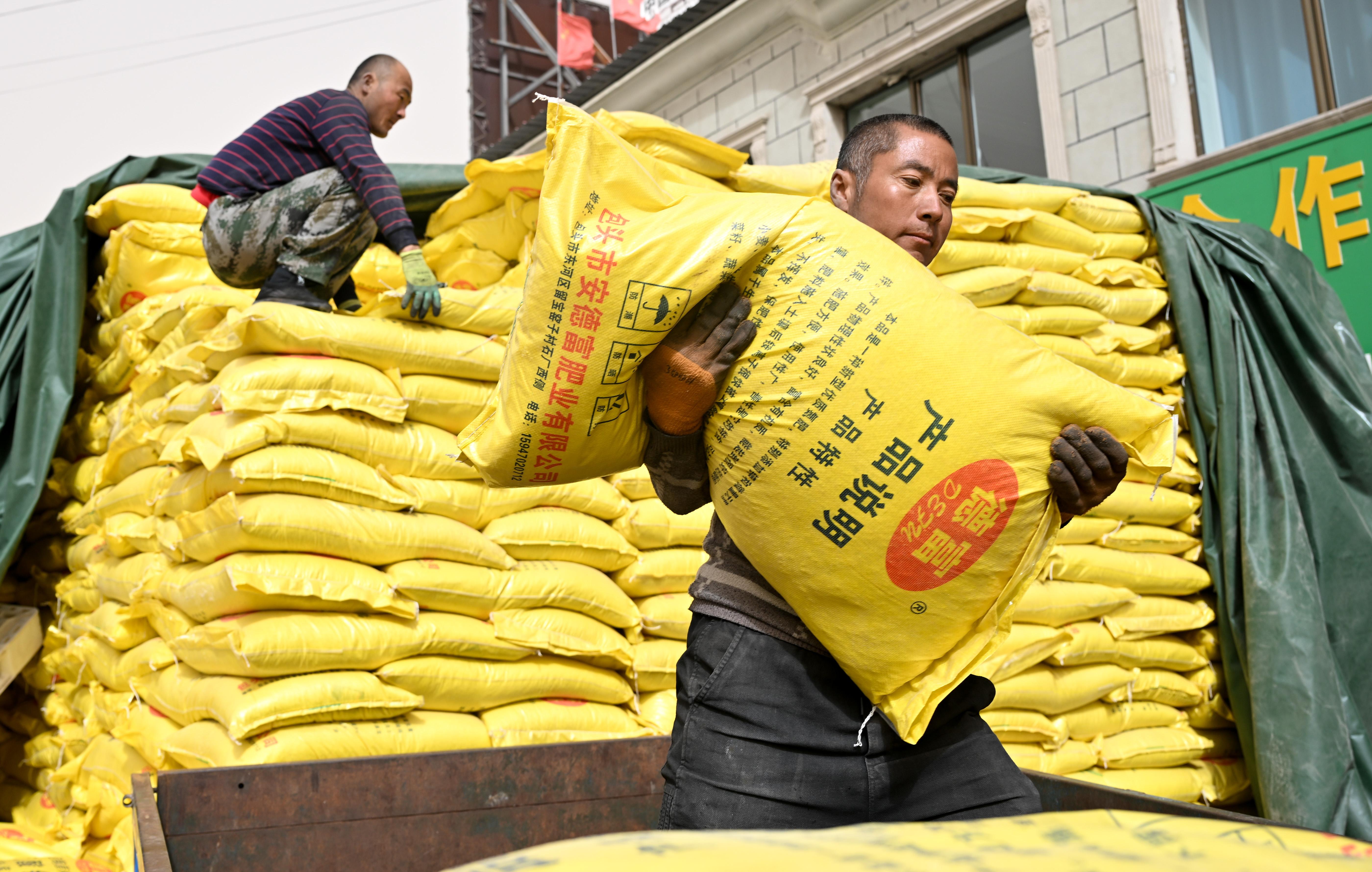 3月27日,工人在内蒙古呼和浩特市土默特左旗敕勒川镇只几梁村年年有余农业发展有限公司搬运化肥。 新华社记者 贝赫 摄