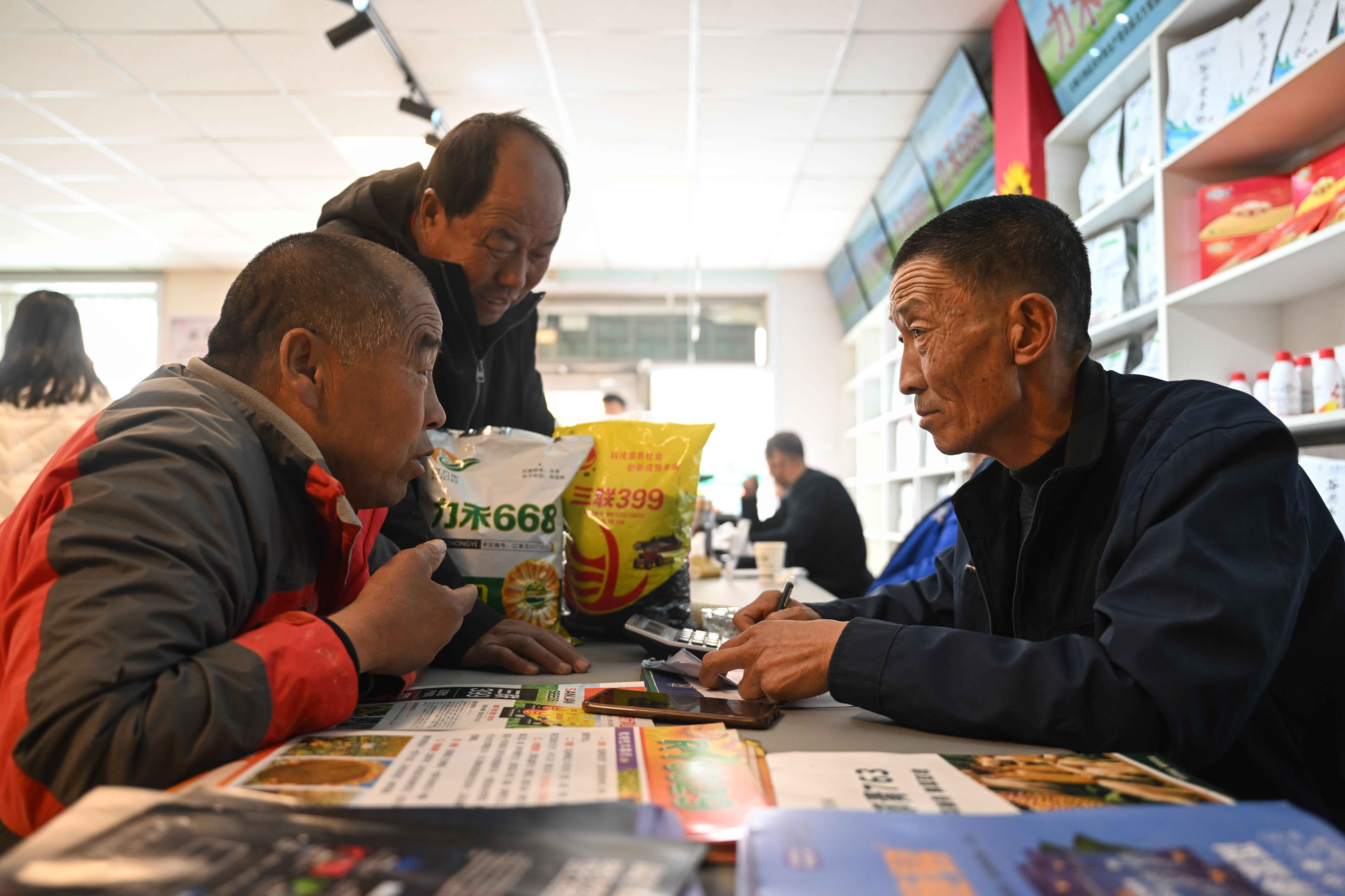 3月27日,村民(前左)在内蒙古呼和浩特市土默特左旗敕勒川镇只几梁村年年有余农业发展有限公司咨询购买农资。 新华社记者 贝赫 摄