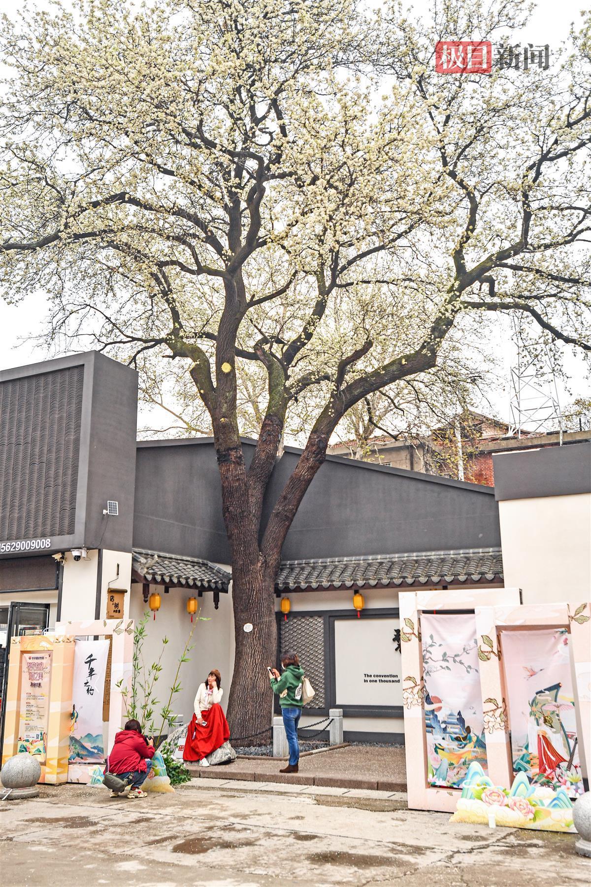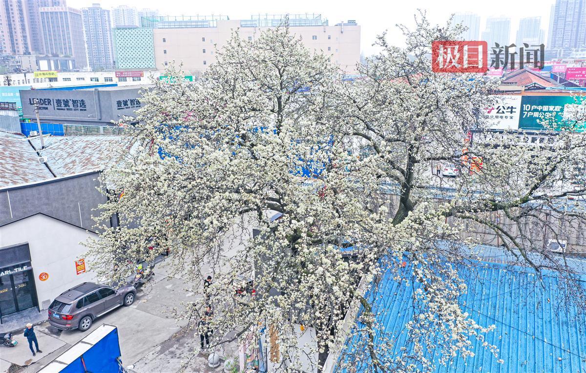3月28日,武汉华中建材市场的杜梨树上繁花挂满枝头,引来游客观赏。树上挂着由武汉市园林和林业局制作的铭牌显示:杜梨,树龄150年。