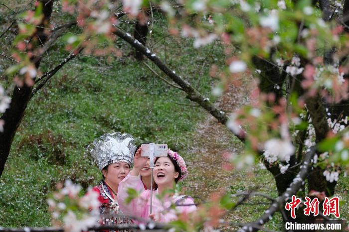 3月29日,一场春雨后,贵州贵安新区樱花园内盛开的万亩樱花呈现落英缤纷景象,市民和游客徜徉其中,感受春天的浪漫。