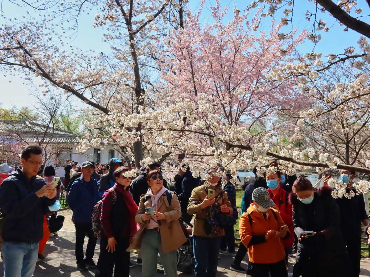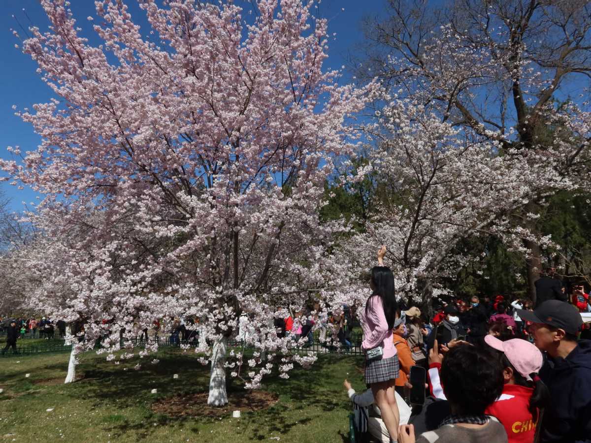 3月29日,北京玉渊潭公园的早樱绽放,吸引众多游客前来赏花拍照。中国日报记者姜东摄