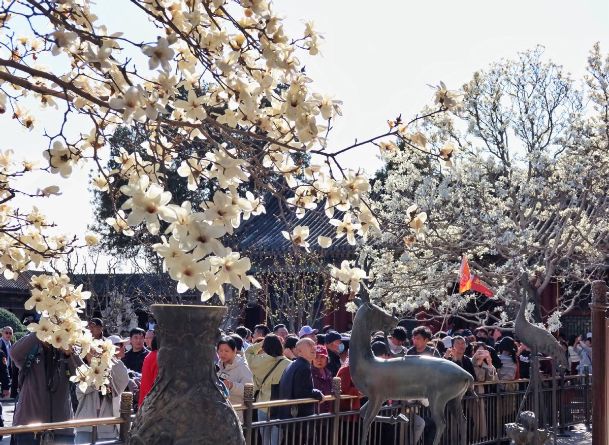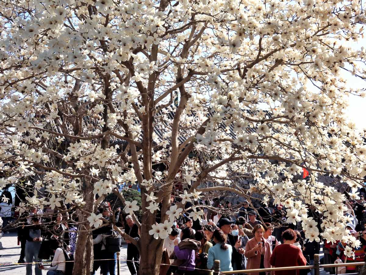 3月29日,游客在北京颐和园观赏盛放的白玉兰。中国日报记者姜东摄