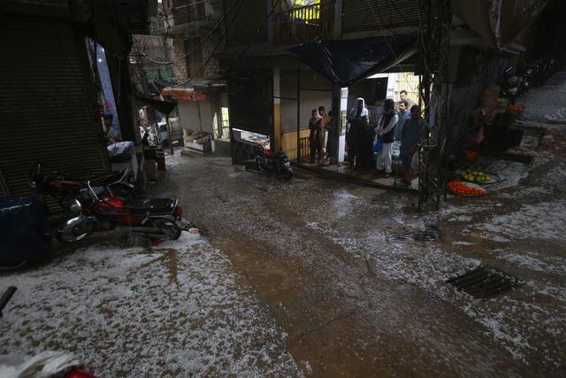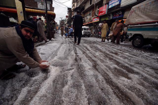 3月30日,在巴基斯坦白沙瓦,人们在落满冰雹的街道上出行。新华社/美联