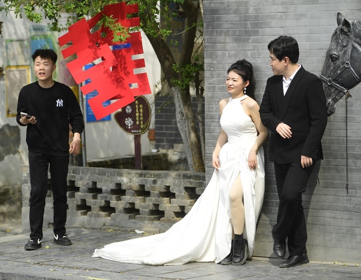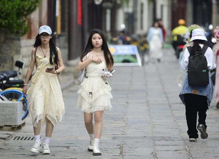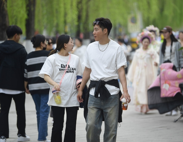 4月1日,游客身着春装在济南曲水亭街游玩。当日济南迎来春分后的高温天,最高温度达到28℃,是近期济南气温最高的一天,不少年轻人纷纷换上了时尚的春装或者清凉的T恤衫外出游玩,漫步在春意盎然、泉水潺潺的泉城老街,十分悠闲惬意。