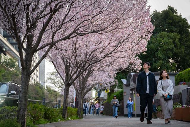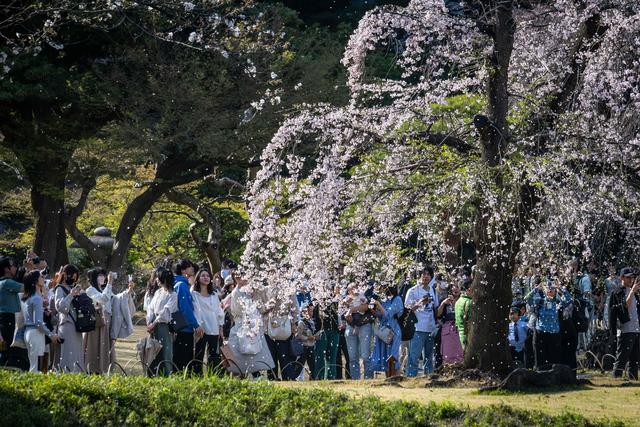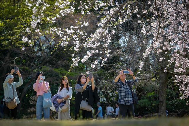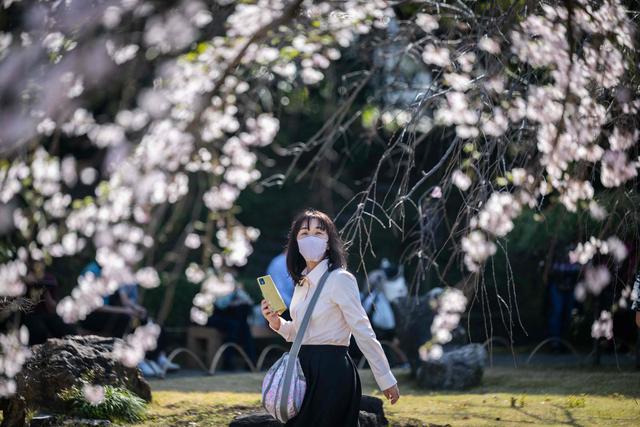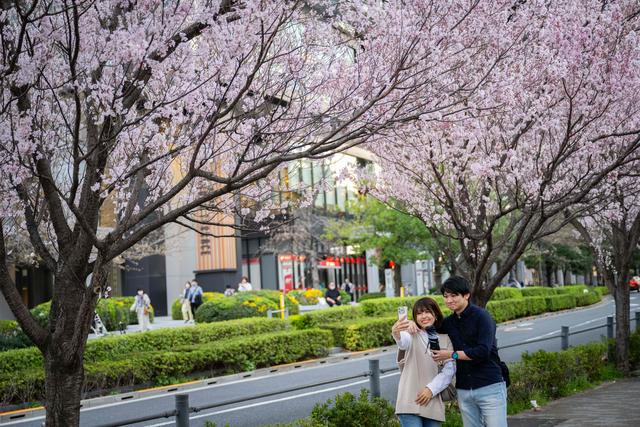 3月31日,在日本东京,人们在户外观赏樱花,拍照留念。新华社/法新