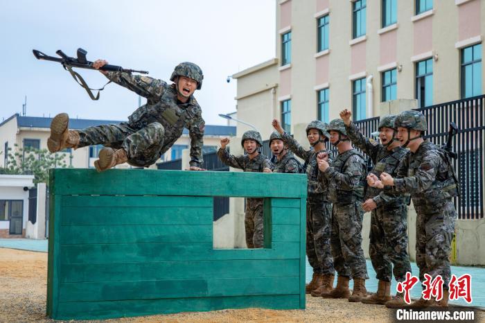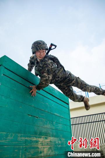 武警官兵在进行飞跃矮墙障碍训练。刘坚摄