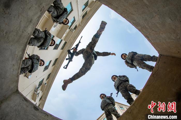 武警官兵在进行翻越高墙障碍训练。刘坚摄