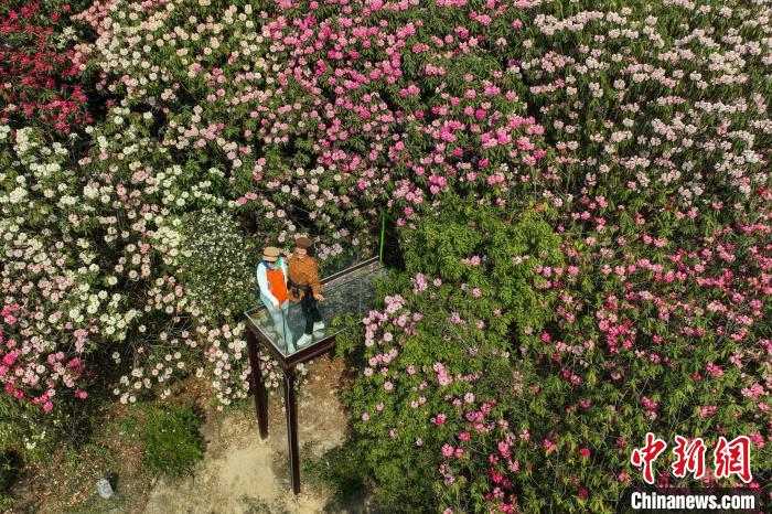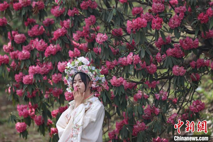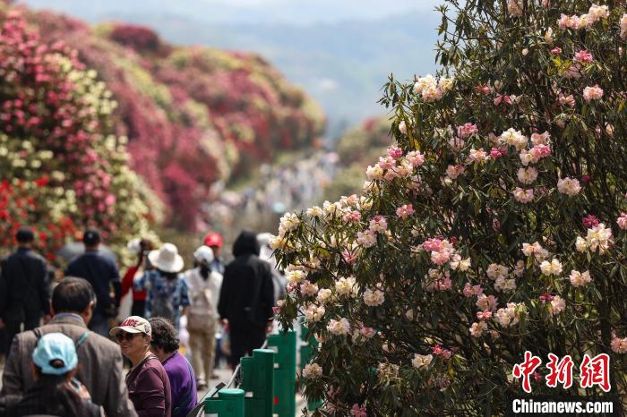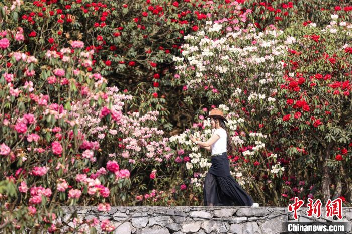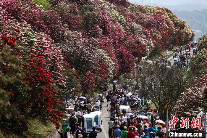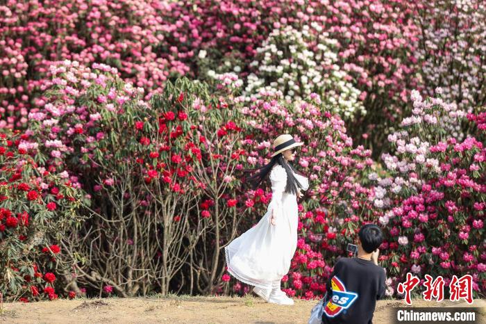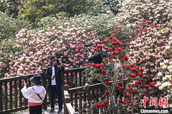 4月3日,百里杜鹃景区盛开的杜鹃花吸引游客打卡。 中新网记者瞿宏伦摄
