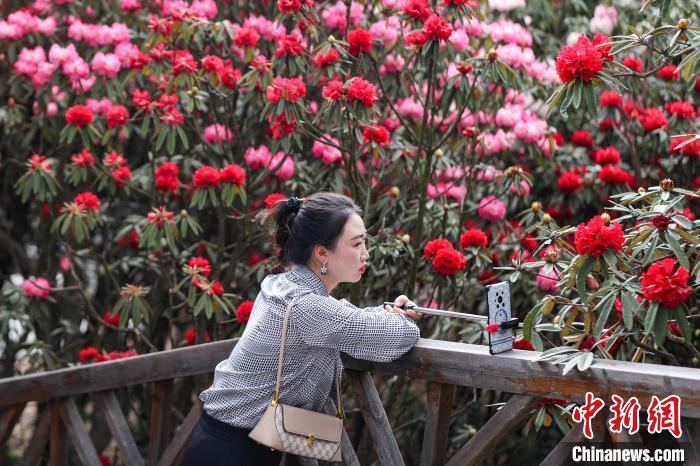 4月3日,游客在百里杜鹃景区自拍留影。 中新网记者瞿宏伦摄