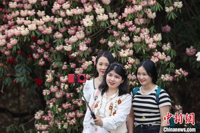 4月3日,游客在百里杜鹃景区打卡。 中新网记者瞿宏伦摄