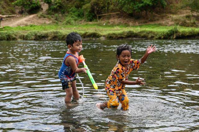 4月6日,在菲律宾布拉干的诺萨加赖河,孩子们在河中戏水。新华社/法新