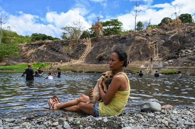 4月6日,在菲律宾布拉干的诺萨加赖河,一名女子抱着狗坐在河边。新华社/法新