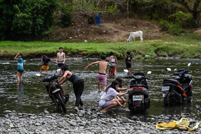 4月6日,在菲律宾布拉干的诺萨加赖河,人们来到河边洗摩托车。新华社/法新