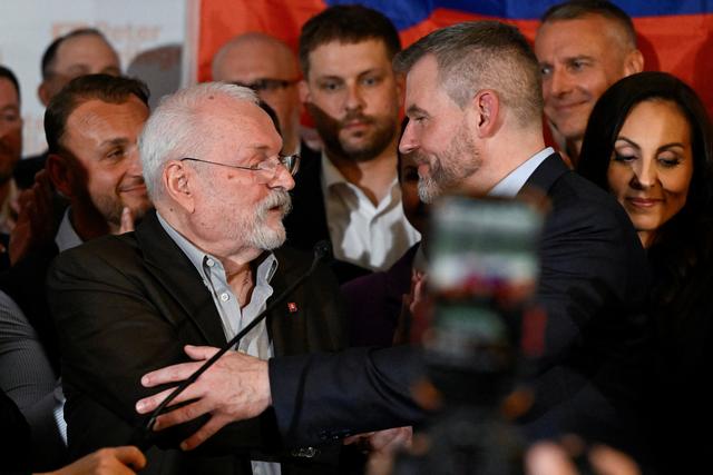 4月7日,在斯洛伐克首都布拉迪斯拉发,胜选的彼得·佩列格里尼(前右)与前总统伊万·加什帕罗维奇(前左)握手。新华社/路透