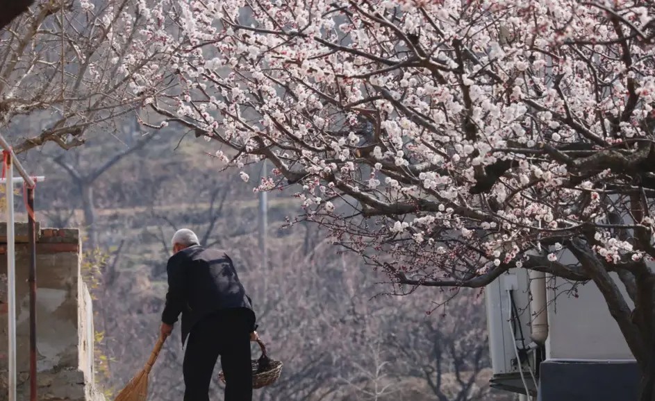 若要赏大片杏花,还是要去村里走走,杏树生长了些年头,枝条舒展,花朵繁密,走在屋舍俨然之中的乡村小径上,光影交错间,花瓣若落在头上、肩上,像极了电影中的升格镜头。