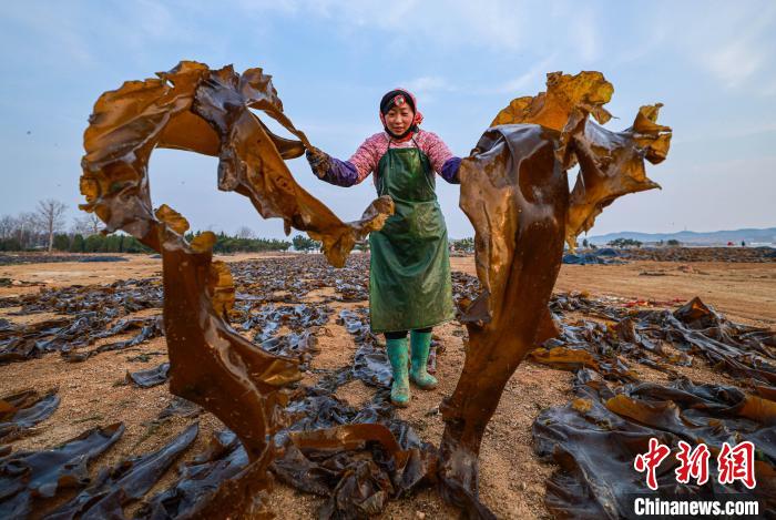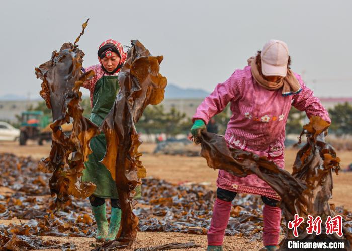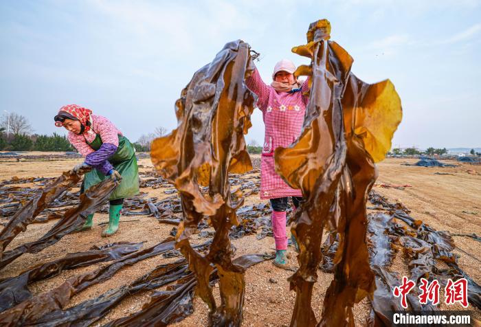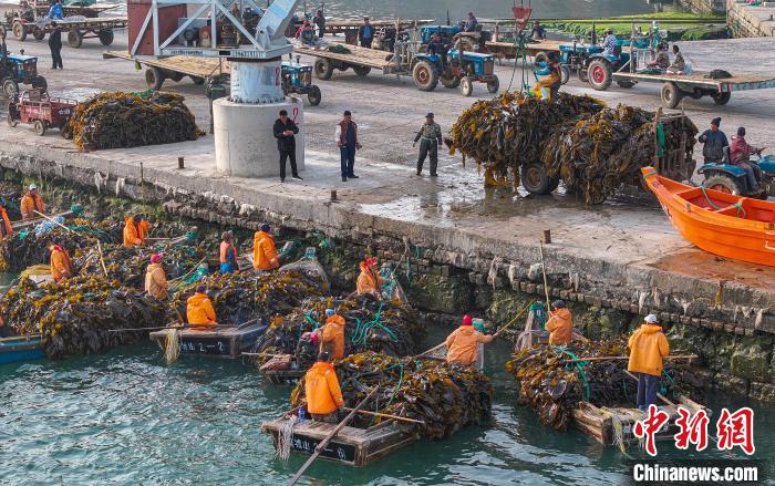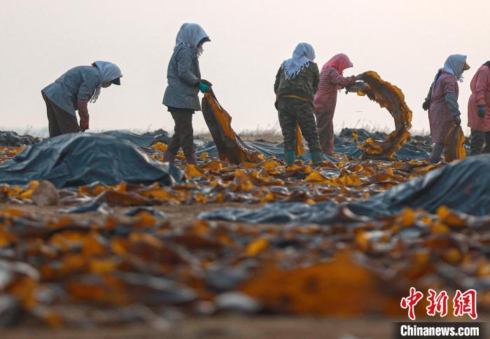 8日,在山东威海荣成市沿海各处海带晒场,养殖工人趁着晴好天气,采收、搬运、晾晒海带。