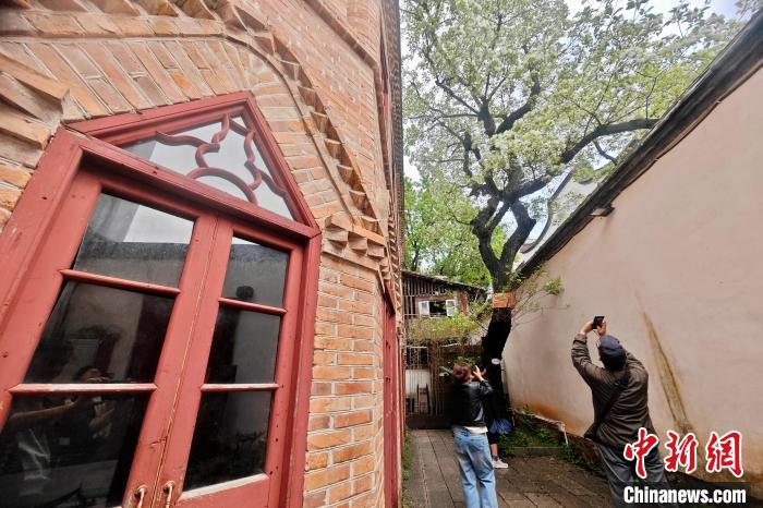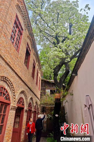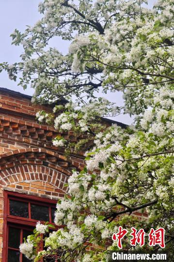 花朵盛开的流苏树与坊巷古建筑相得益彰。 中新网记者王东明摄