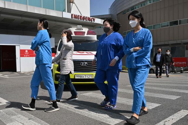 这是4月1日,医务人员走在韩国首尔一所医院外。新华社/法新