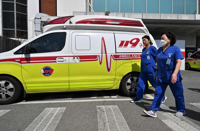 这是4月1日,医务人员经过停放在韩国首尔一所医院的急救车。新华社/法新