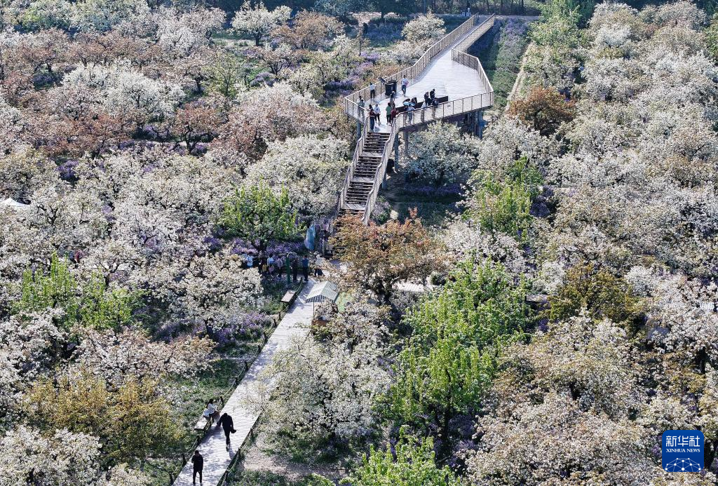 4月8日,游人在江苏三台山国家森林公园观赏梨花和二月兰(无人机照片)。